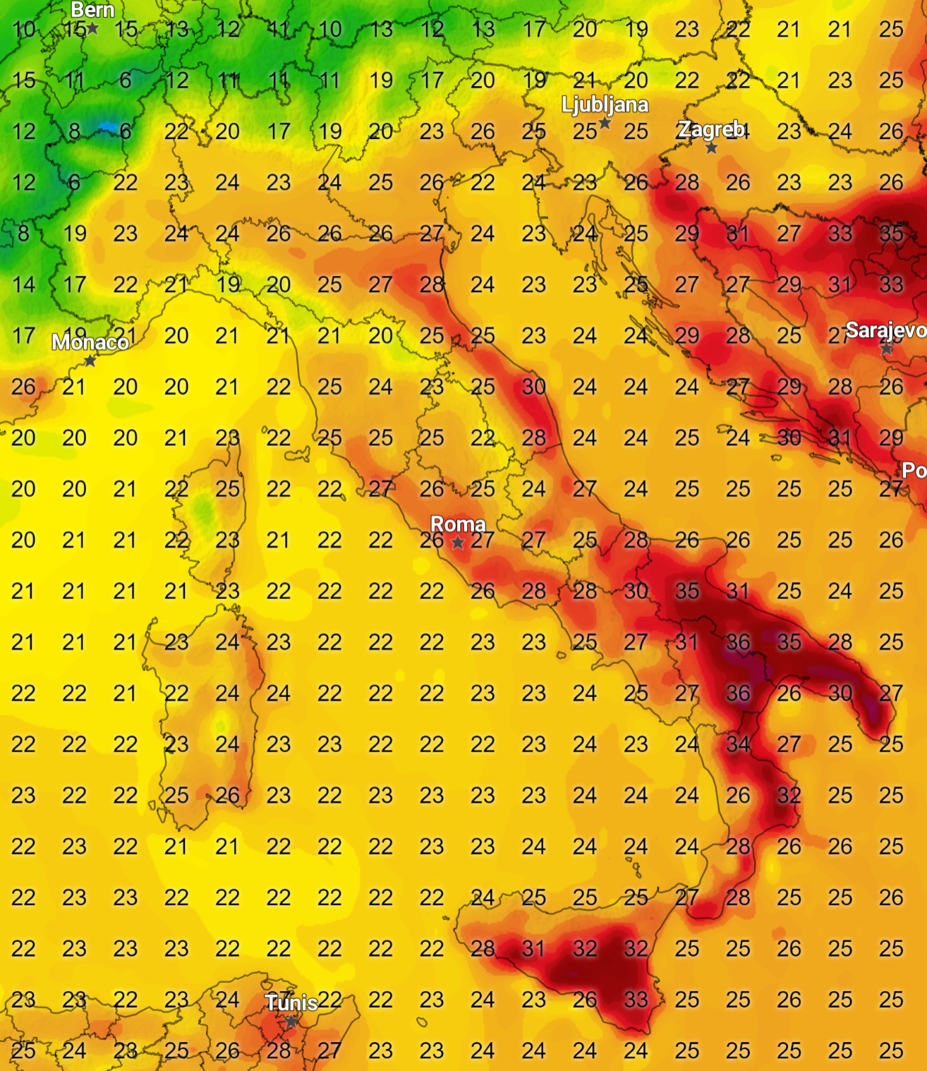 Nell’elaborato delle temperature registrate alle ore 11.00, notiamo una diminuzione rispetto a quelle registrate ieri e sono previste in ulteriore diminuzione nelle prossime ore: