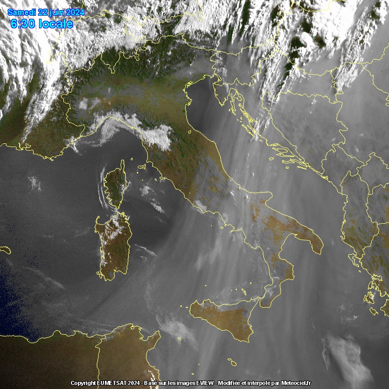 Nell’immagine satellitare delle 6.30 di oggi Sabato 22 Giugno, notiamo come l’aria più fredda abbia già iniziato a scalzare l’umidità ed il pulviscolo al Centro Nord e sulla Sardegna (clicca per ingrandire):