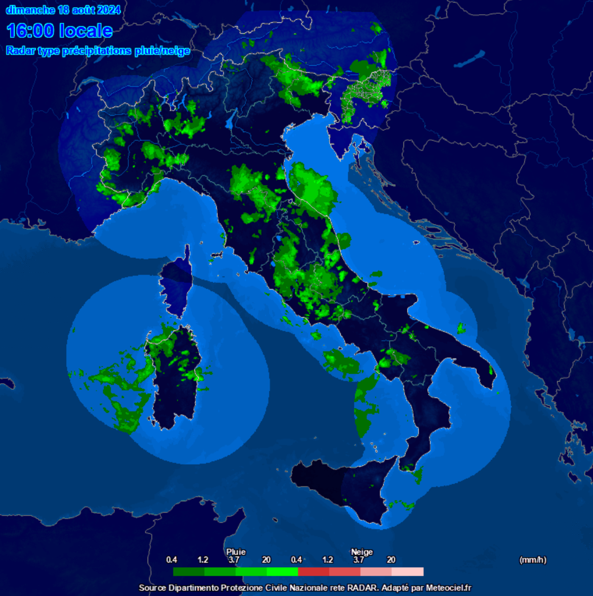 L’immagine del radar piogge ci mostra le precipitazioni in atto sull’Italia alle 16 (clicca per ingrandire):