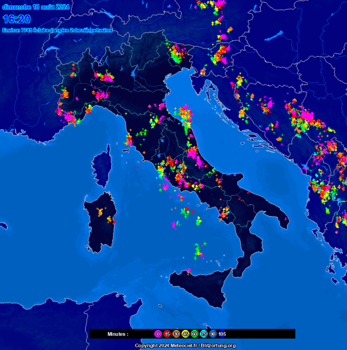 Il radar dei fulmini evidenzia le frequenti fulminazioni presenti su buona parte del Paese (clicca per ingrandire):