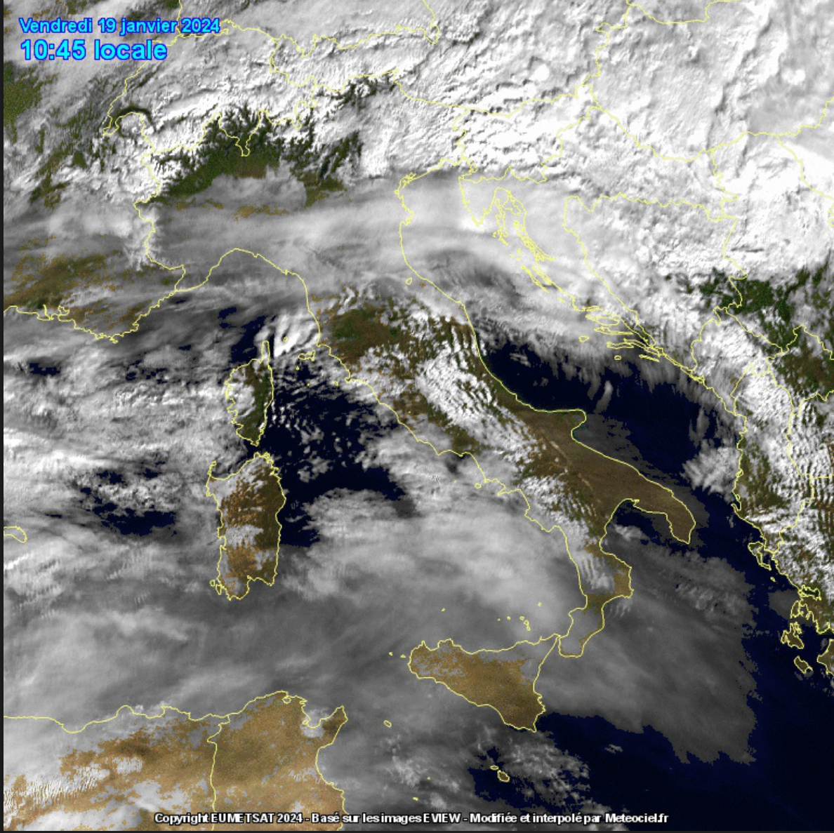 Come vediamo dall’immagine satellitare la perturbazione annunciata ha raggiunto l’Italia, apportando una copertura nuvolosa irregolare su tutto il Paese:
