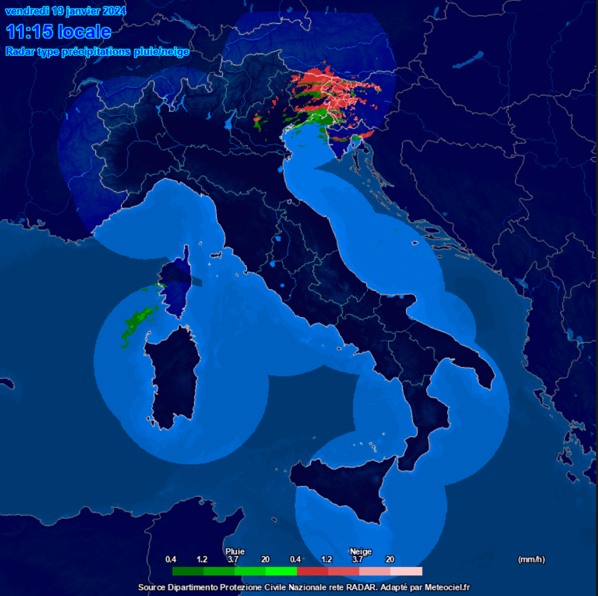 Il radar attualmente vede piogge sulle coste del Veneto e Friuli Venezia Giulia e nevicate sui monti a quote molto basse: