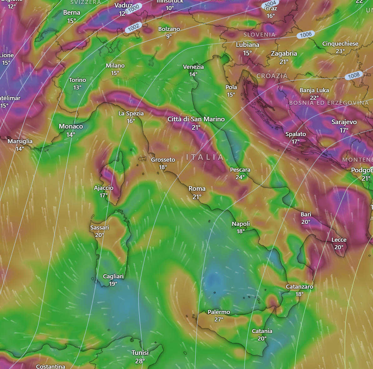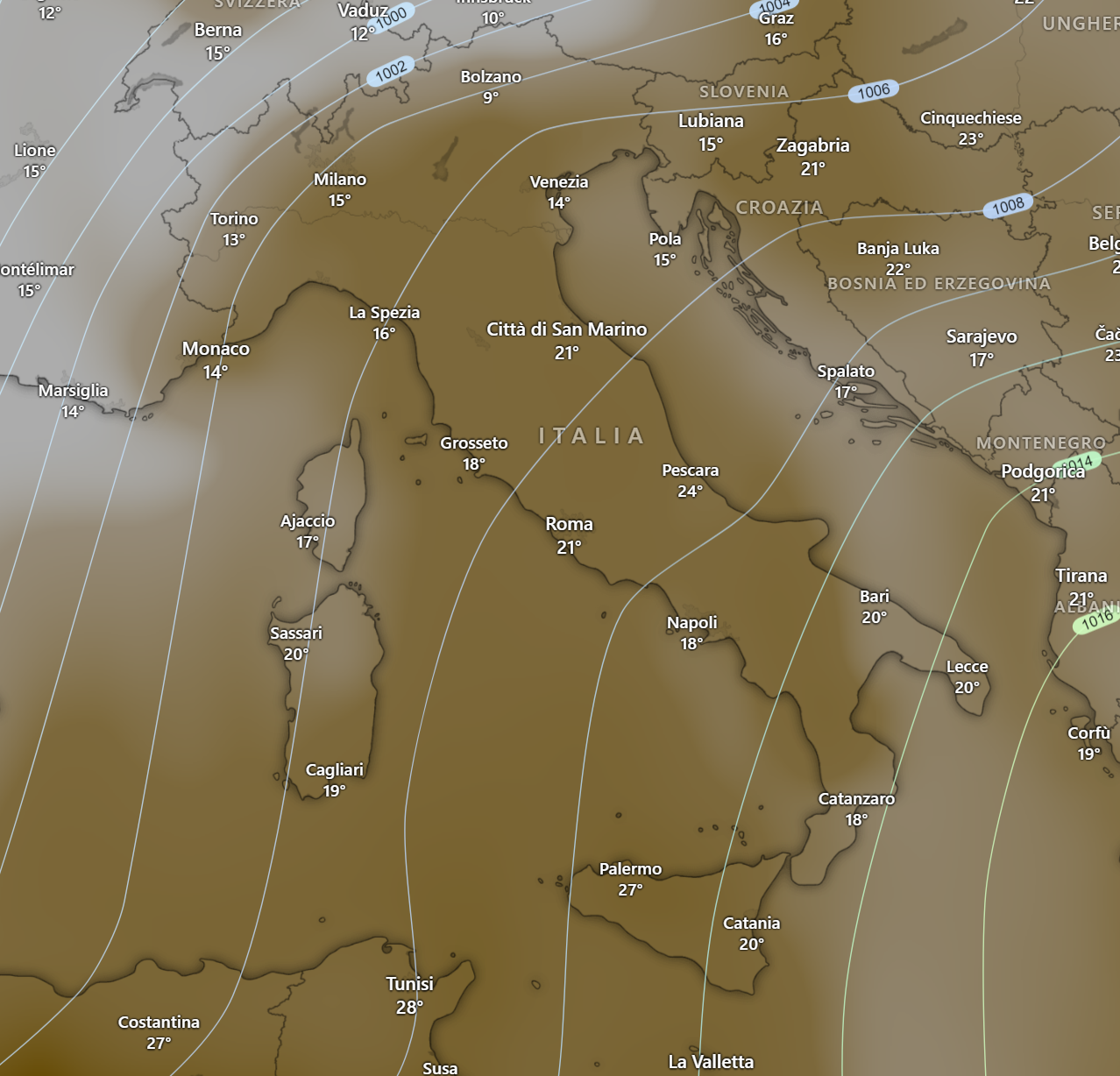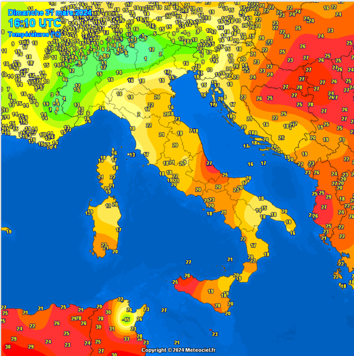Le temperature registrate alle ore 18 mostrano valori ben al di sopra delle medie stagionali, raggiungendo i 28 gradi sull’Italia Centrale e la Sicilia.