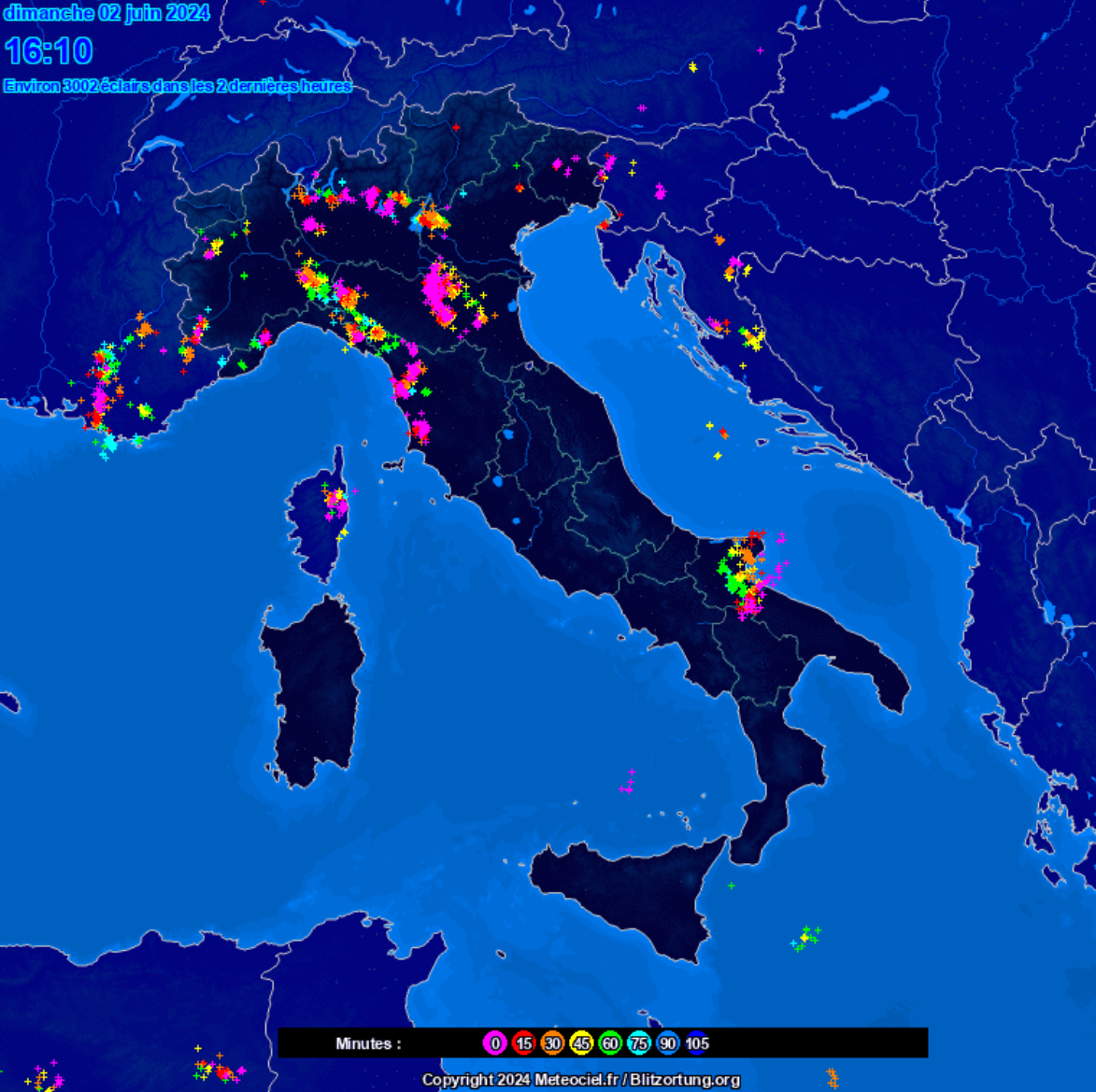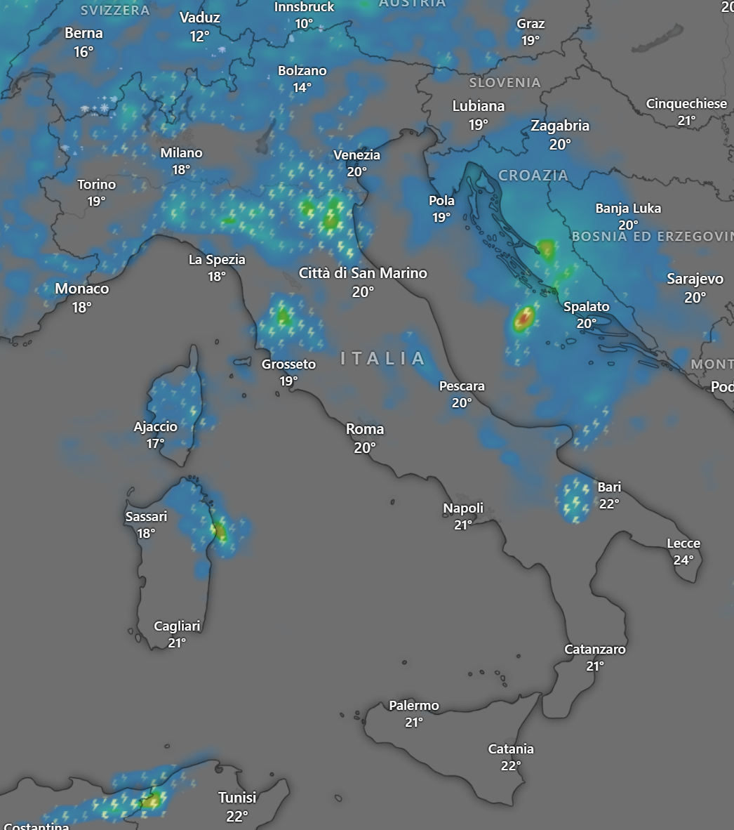Sempre nel pomeriggio si sono attivati dei temporali anche di forte intensità, sempre su quasi tutto il Nord Italia, oltre la Toscana e l’alta Puglia: