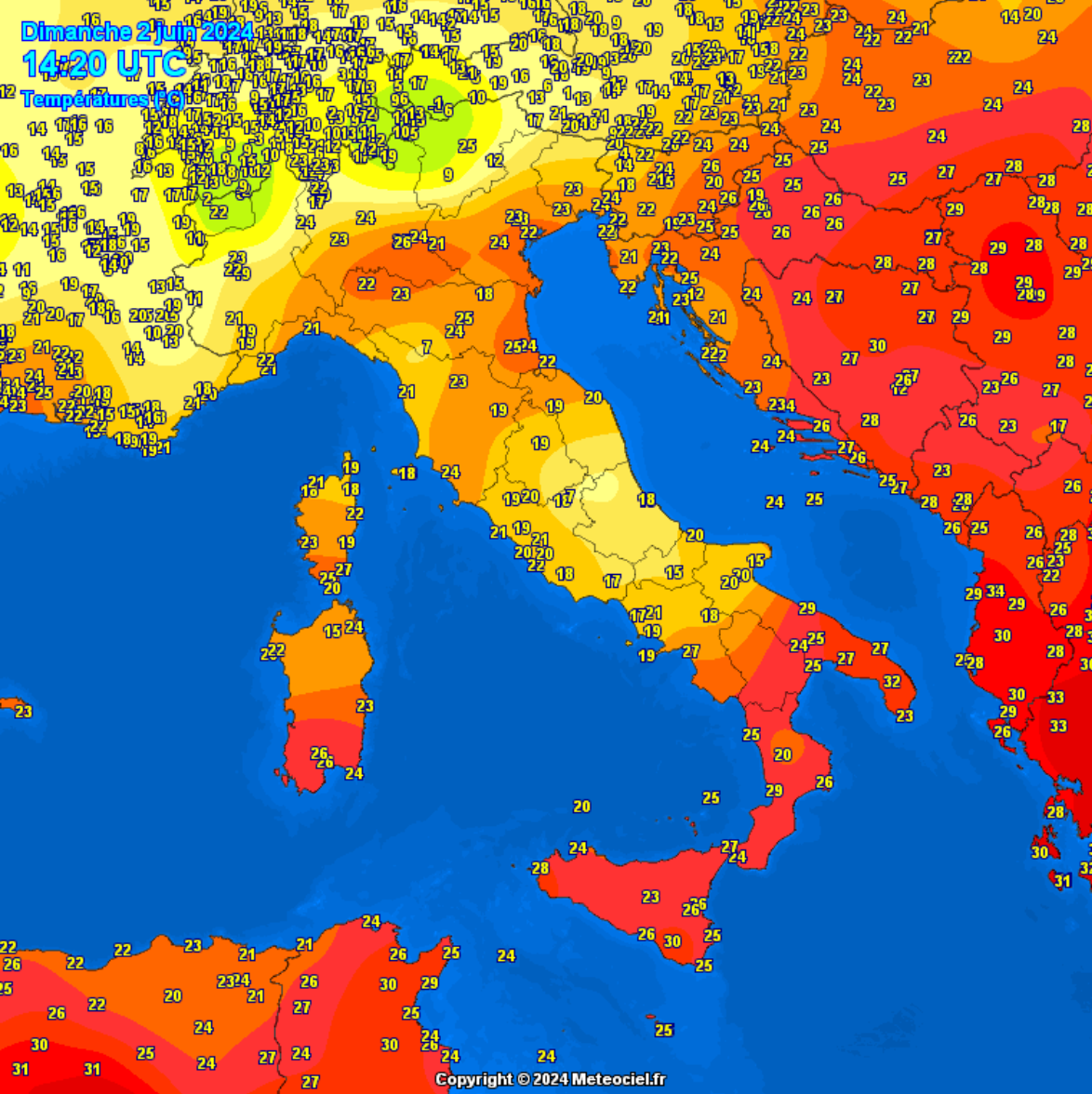 Le temperature attuali al Centro Nord sono comprese tra i 19 ed i 24 gradi, mentre al Sud e sulle Isole maggiori variano dai 24 fino ai 30 gradi della Puglia e la Sicilia: