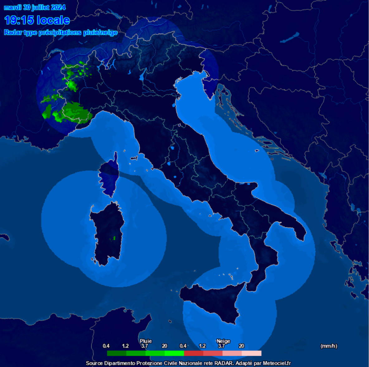 Attualmente il radar piogge e temporali segnala fenomeni anche intensi su Piemonte, Valle d’Aosta e Liguria (clicca per ingrandire):