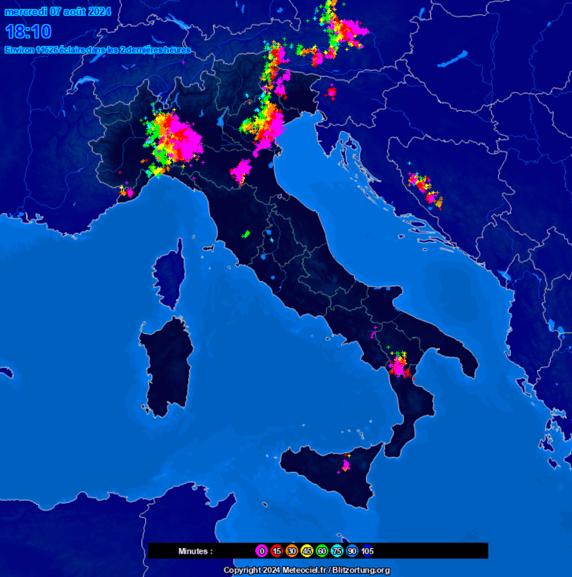 Il radar dei fulmini evidenzia le frequenti fulminazioni presenti su buona parte del Paese (clicca per ingrandire):