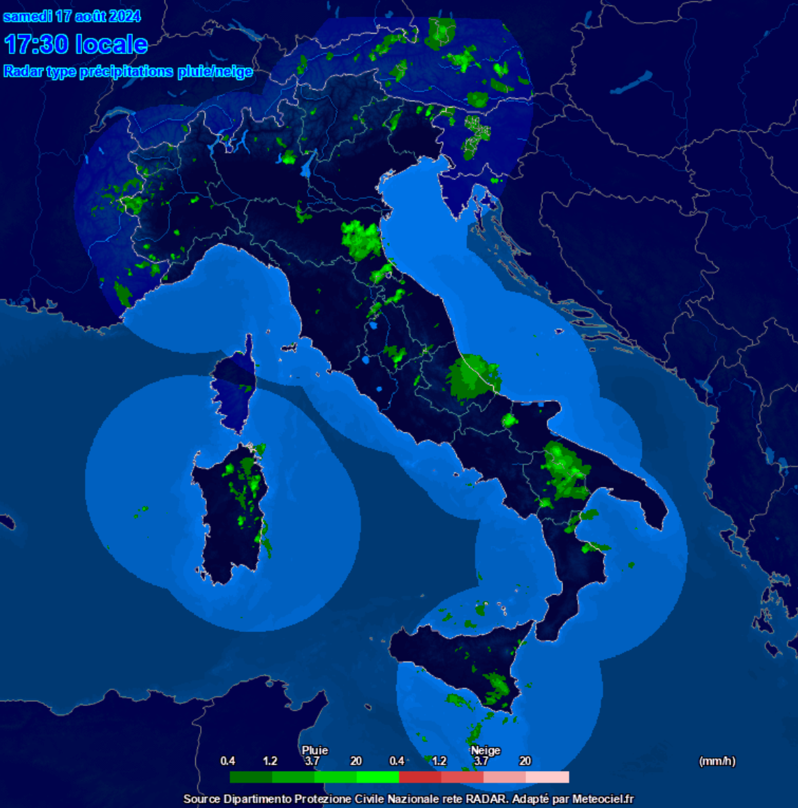 L’immagine del radar piogge ci mostra le precipitazioni in atto sull’Italia alle 17 e 30 (clicca per ingrandire):