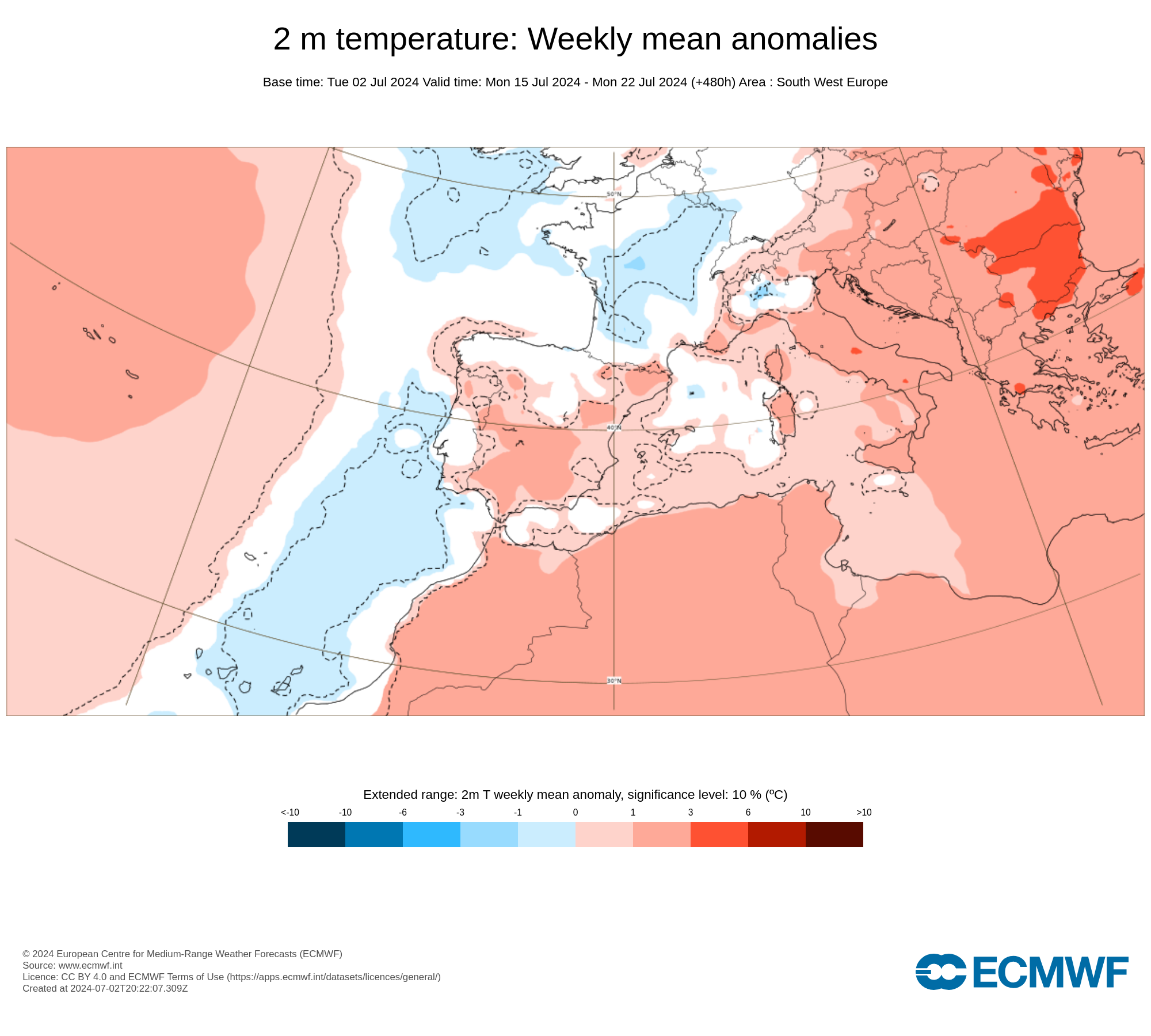 Le temperature previste nella seconda decade di Luglio, al Nord Ovest e pianura padana, sono previste nella media se non leggermente al di sotto, mentre al Centro Sud e Isole maggiori, sono previste anomalie rispetto alle medie del periodo fino a 2° (che nel reale si trasformano in vari gradi al di sopra delle temperature medie) (clicca per ingrandire):