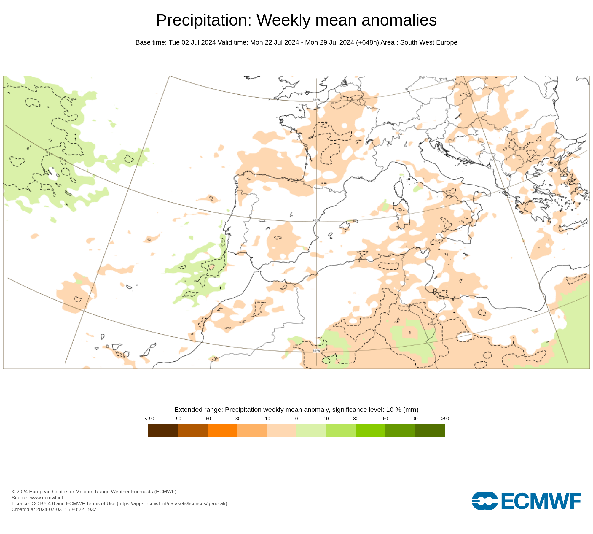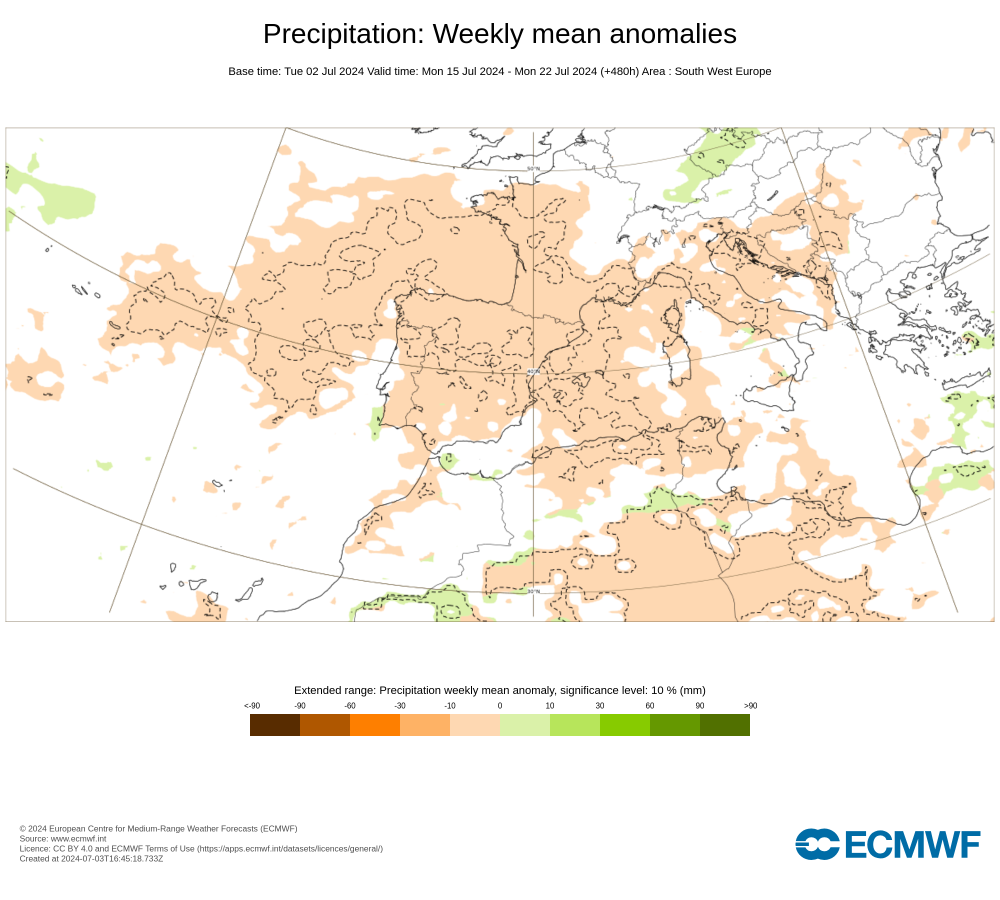 Nell’ elaborato grafico previsto per la seconda decade di Luglio 2024, sull’Italia sono previste precipitazioni sotto la media stagionale, su quasi tutto il territorio, ad esclusione del Nord Ovest ed estremo Sud dove dovrebbero rientrare nelle precipitazioni canoniche del periodo (clicca per ingrandire):