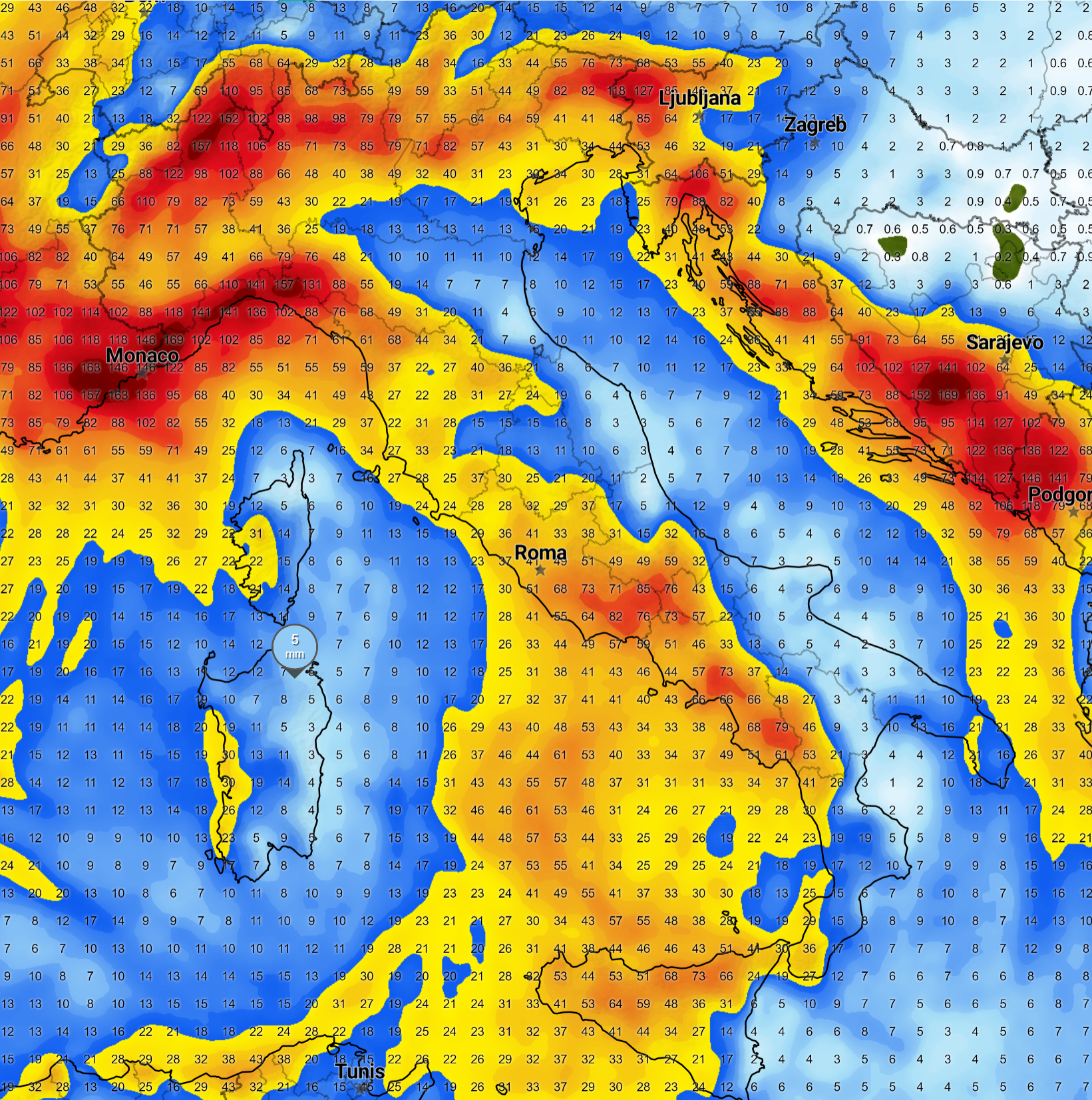 I numeri che vedete sono i millimetri di pioggia previsti e considerate che ogni millimetro di pioggia corrisponde ad un litro di acqua per metro quadro (clicca per ingrandire):