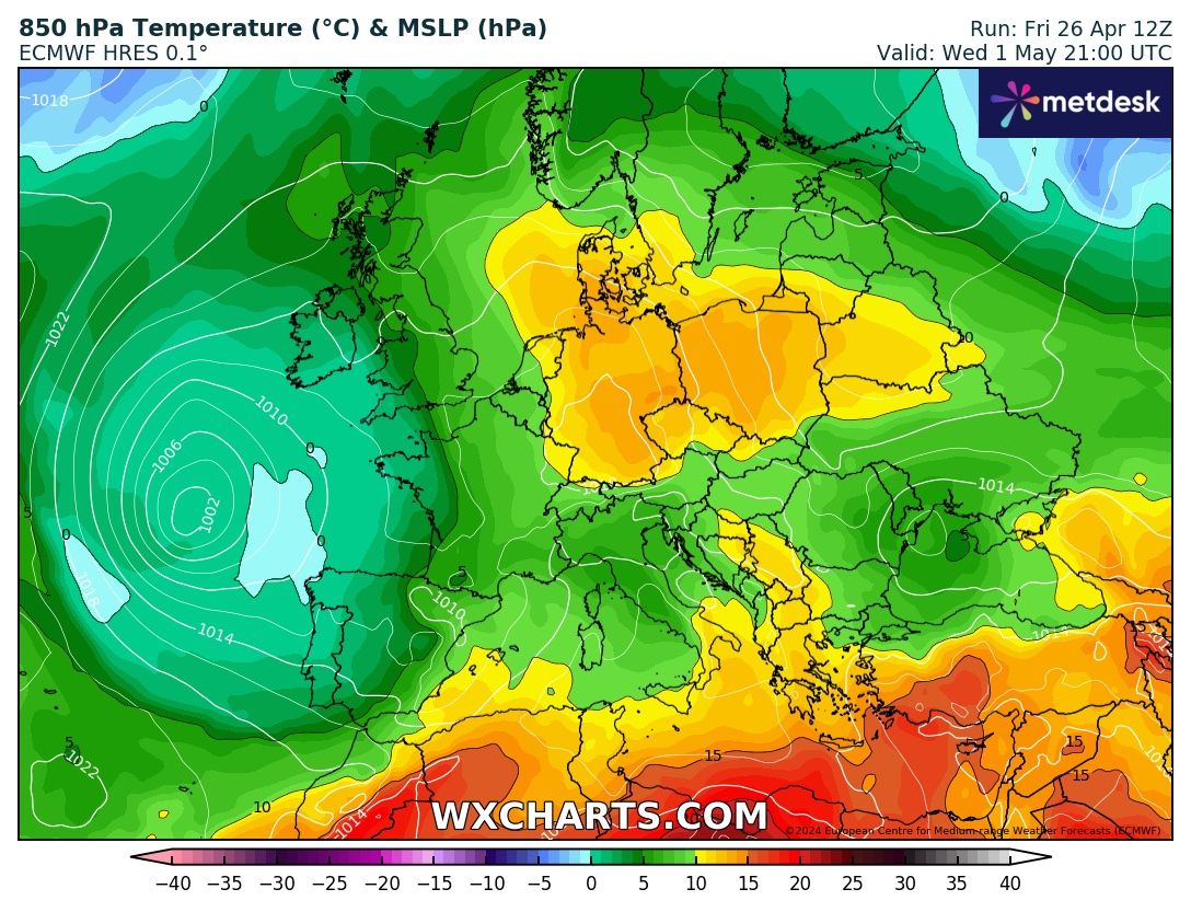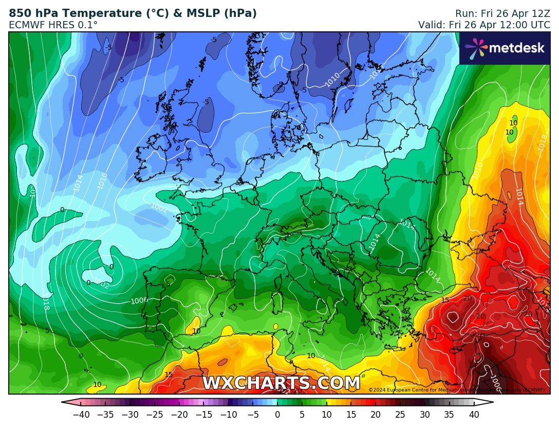 Nell’elaborato la situazione attuale delle temperature e notiamo come l’Europa centro occidentale sia ancora interessata da temperature fresche per la stagione: