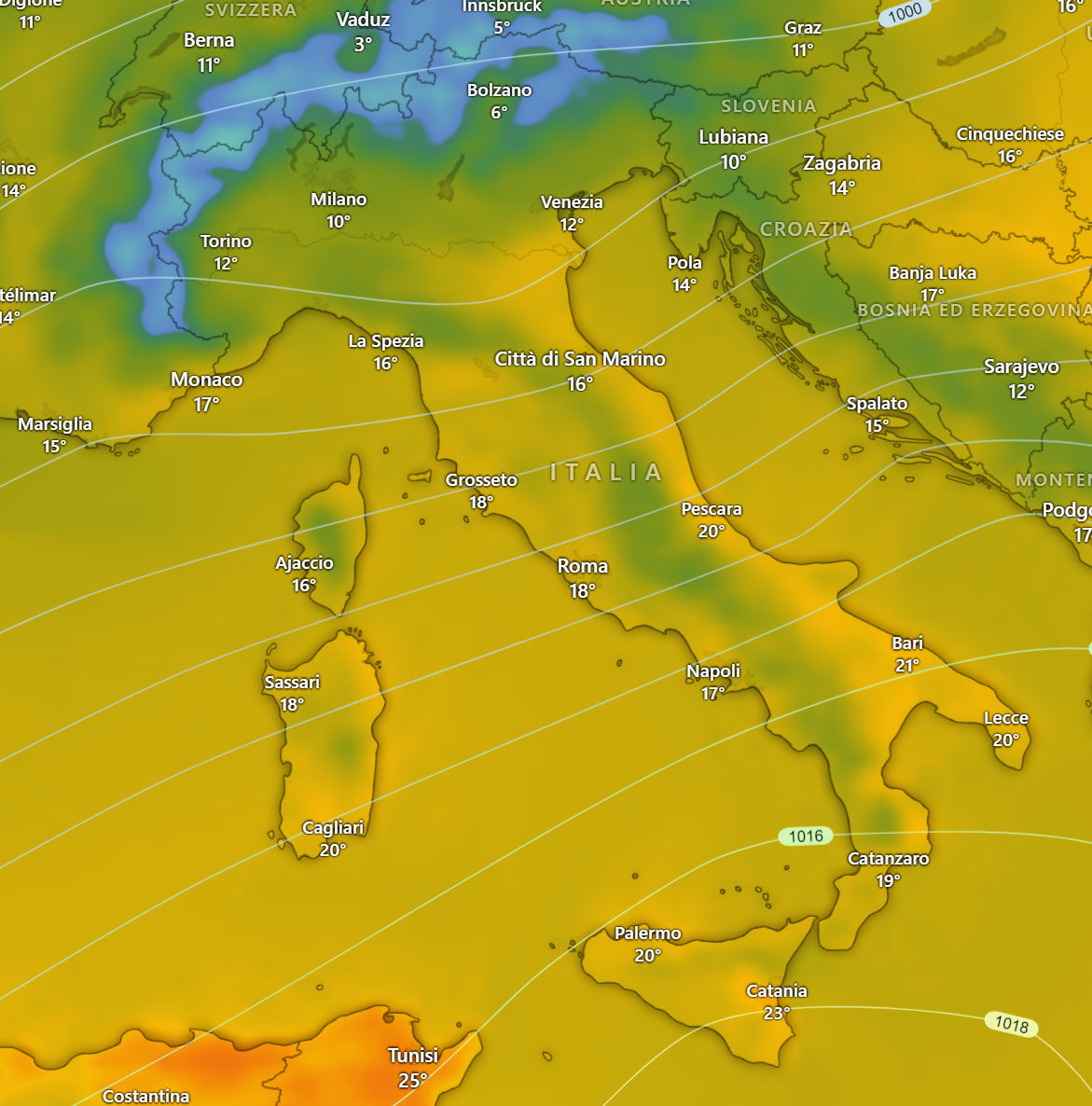Le temperature massime saranno più attenuate al Nord e saranno comprese tra i 10 ed i 14°, mentre sul resto del Paese saranno comprese tra i 16 ed i 23°.