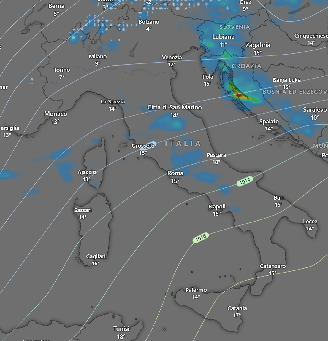 Alle ore 15 avremo un discreto miglioramento, delle condizioni del tempo sul Nord ovest, mentre le piogge si concentreranno al Nord Est, al Centro, oltre che sulla Sardegna e Campania, con temporali sulla Toscana e l’Emilia Romagna.