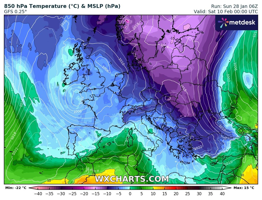Altra aria gelida è prevista per il giorno Sabato 10 febbraio ed andrebbe a coinvolgere tutta l’Europa (temperature previste a 850 hPa circa 1500 metri d’altezza):