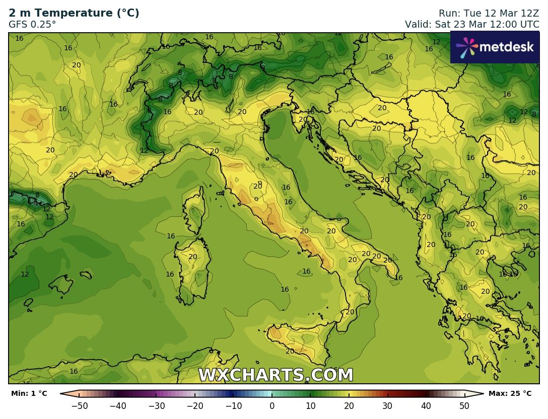 In questo elaborato vediamo le temperature previste per sabato 23 Marzo, dove si evince la temperatura media compresa tra i 16 ed i 20 gradi su quasi tutto il territorio, mentre sulla Toscana, Lazio, Campania, Friuli Venezia Giulia e Sicilia le temperature dovrebbero toccare i 25° con punte fino a 28°: