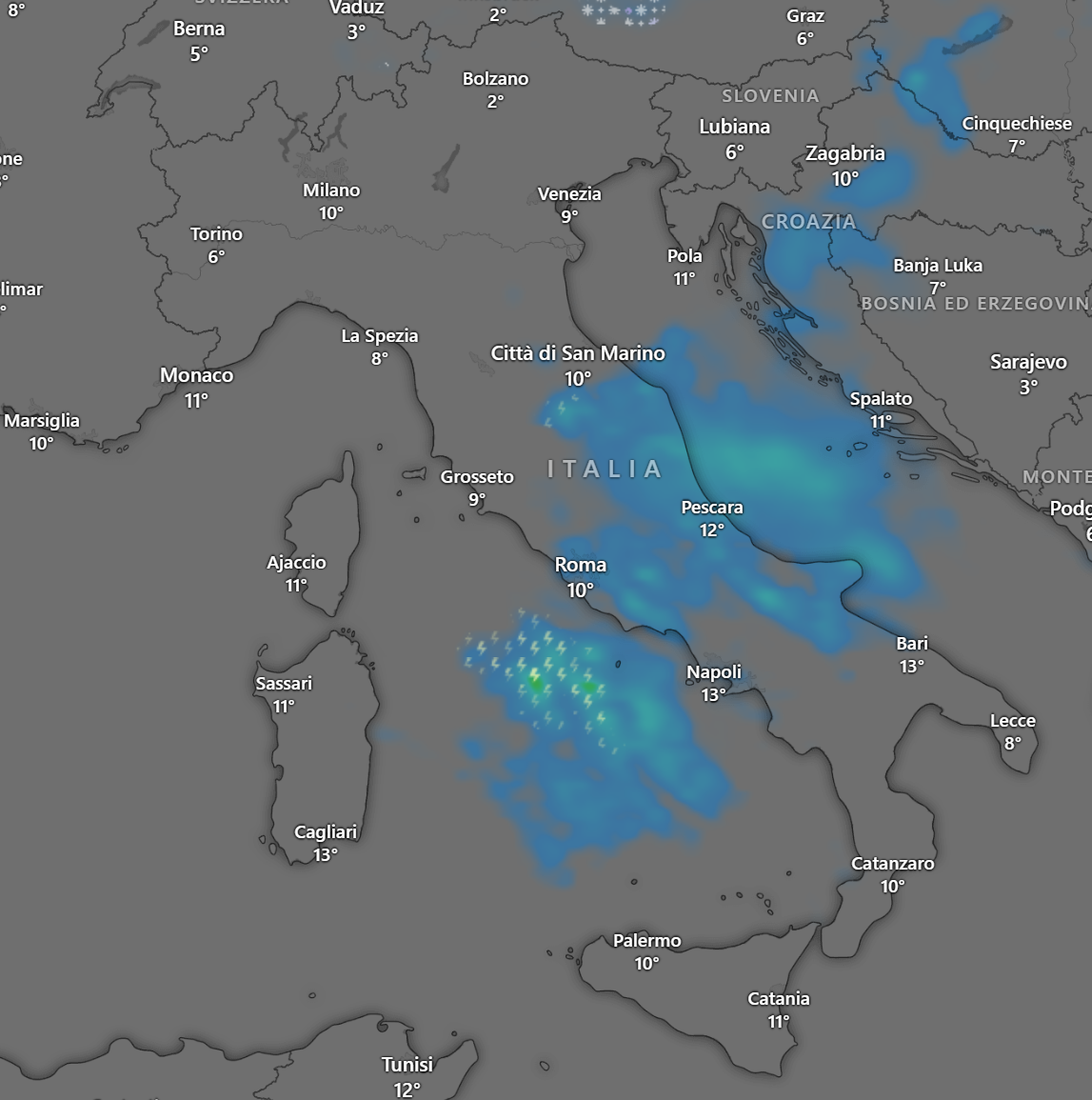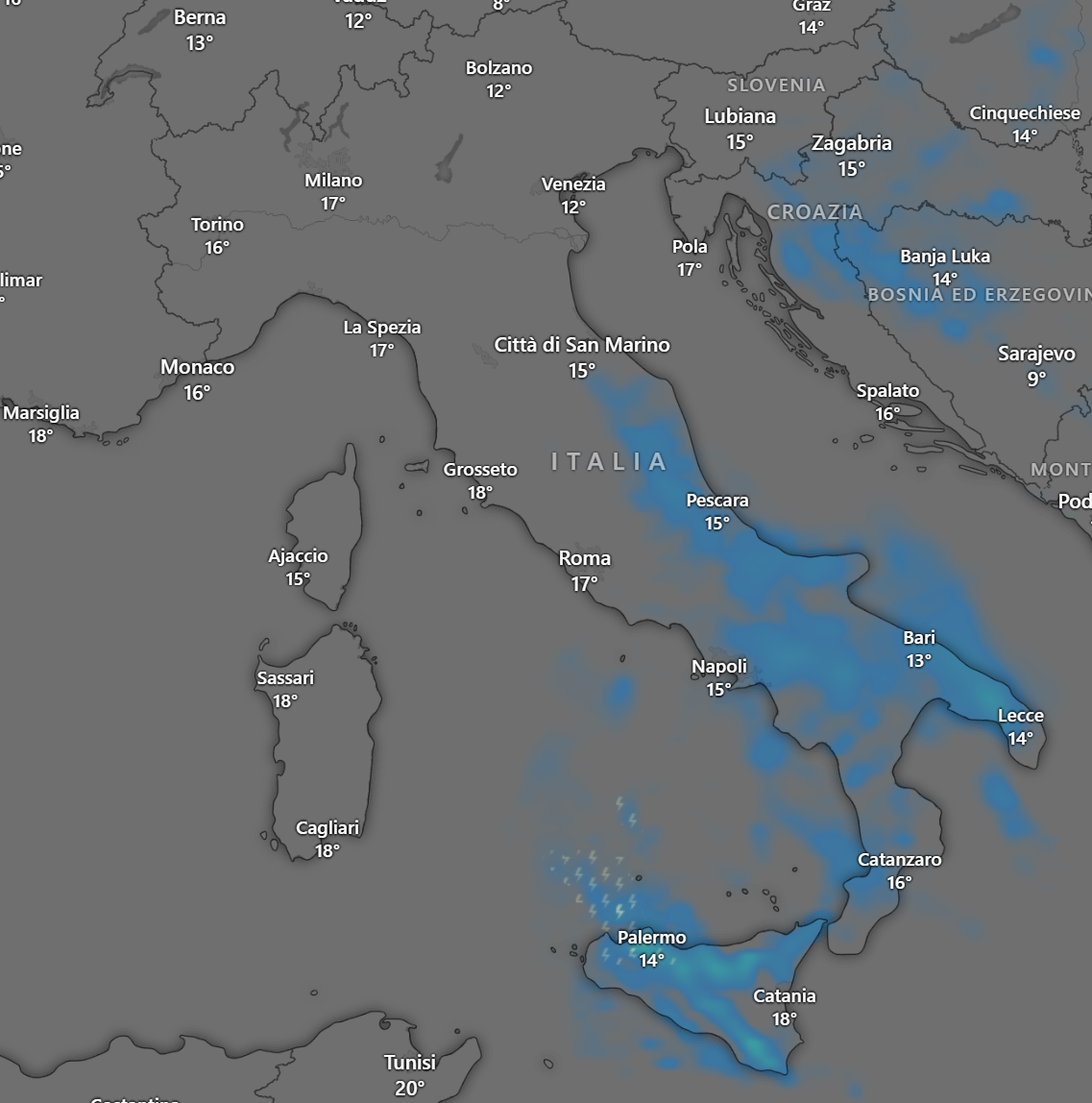 Nella prima mattinata le piogge saranno sparse al Centro e più intense al Sud con temporali sulla Sicilia.