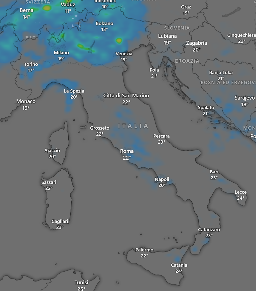 Sul resto del Paese vi saranno delle piogge sulla dorsale Appenninica, oltre a temporali su tutte le regioni bagnate dal mar Adriatico: