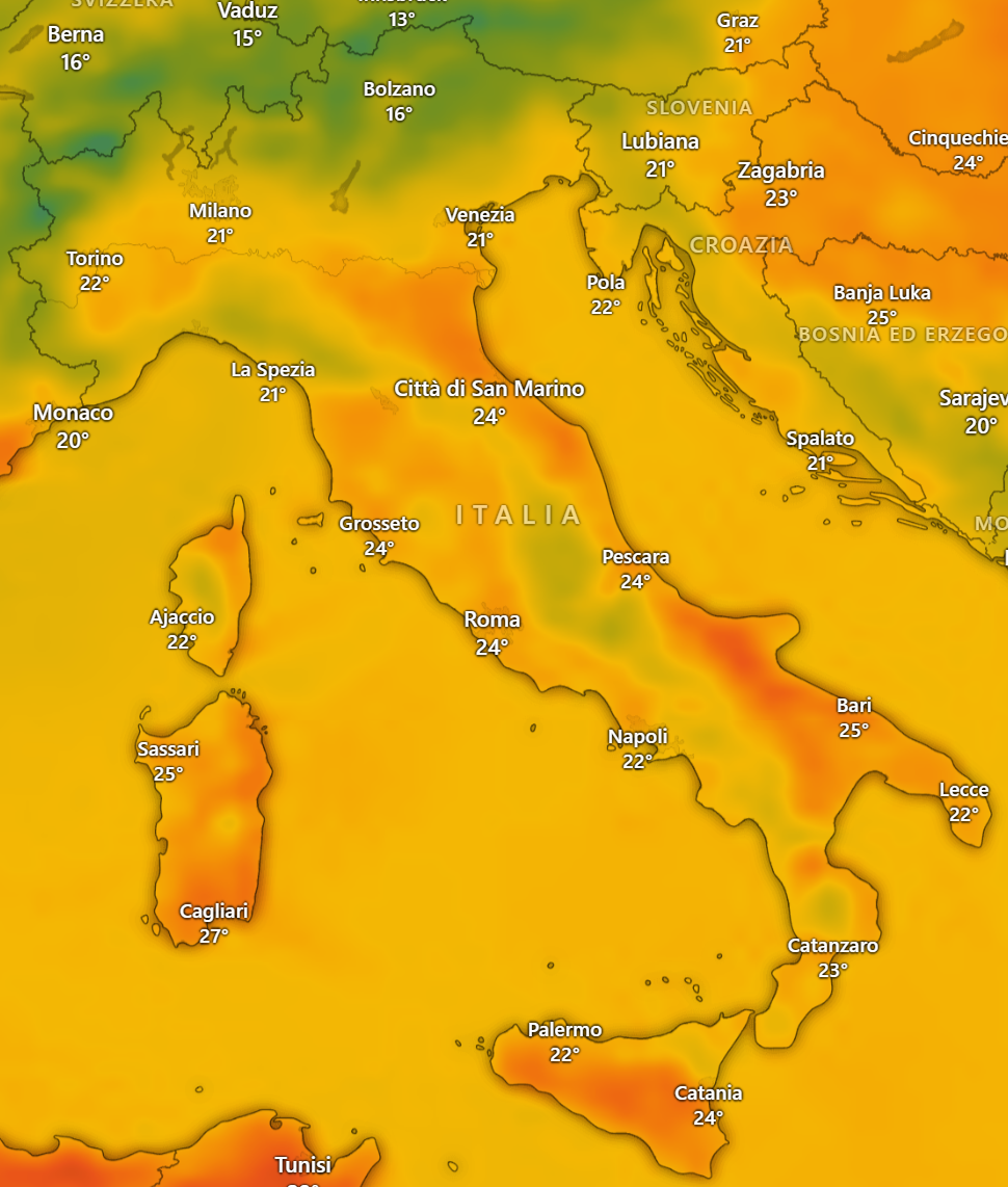 Le temperature si manterranno su valori abbastanza gradevoli su tutto il territorio, con le massime che si attesteranno intorno ai 20° al Nord fino ai 25° al Centro Sud con punte di 27° sulle Isole maggiori: