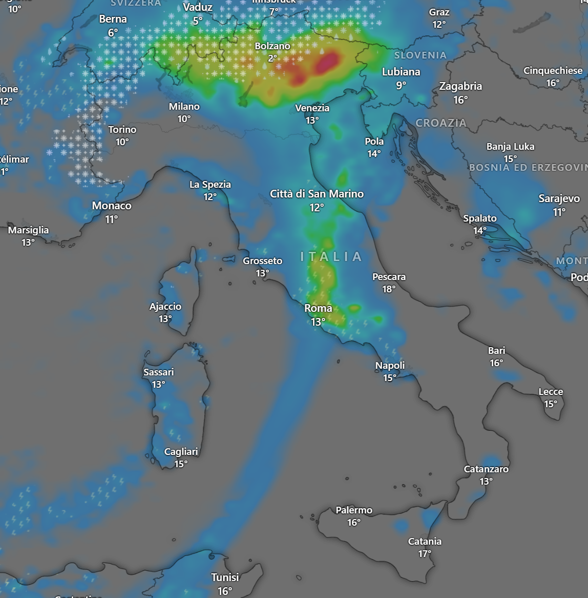 Questa notte una perturbazione ha raggiunto l’Italia apportando piogge su quasi tutti i settori e nevicate sulle Alpi a quote medie.