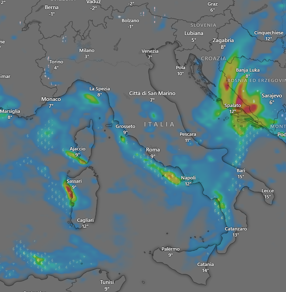 Entro il pomeriggio vi sarà un certo miglioramento sul settore di Nord Est, mentre le precipitazioni si concentreranno sul Nord Est ed al Centro del Paese, dove vi saranno anche intensi temporali.