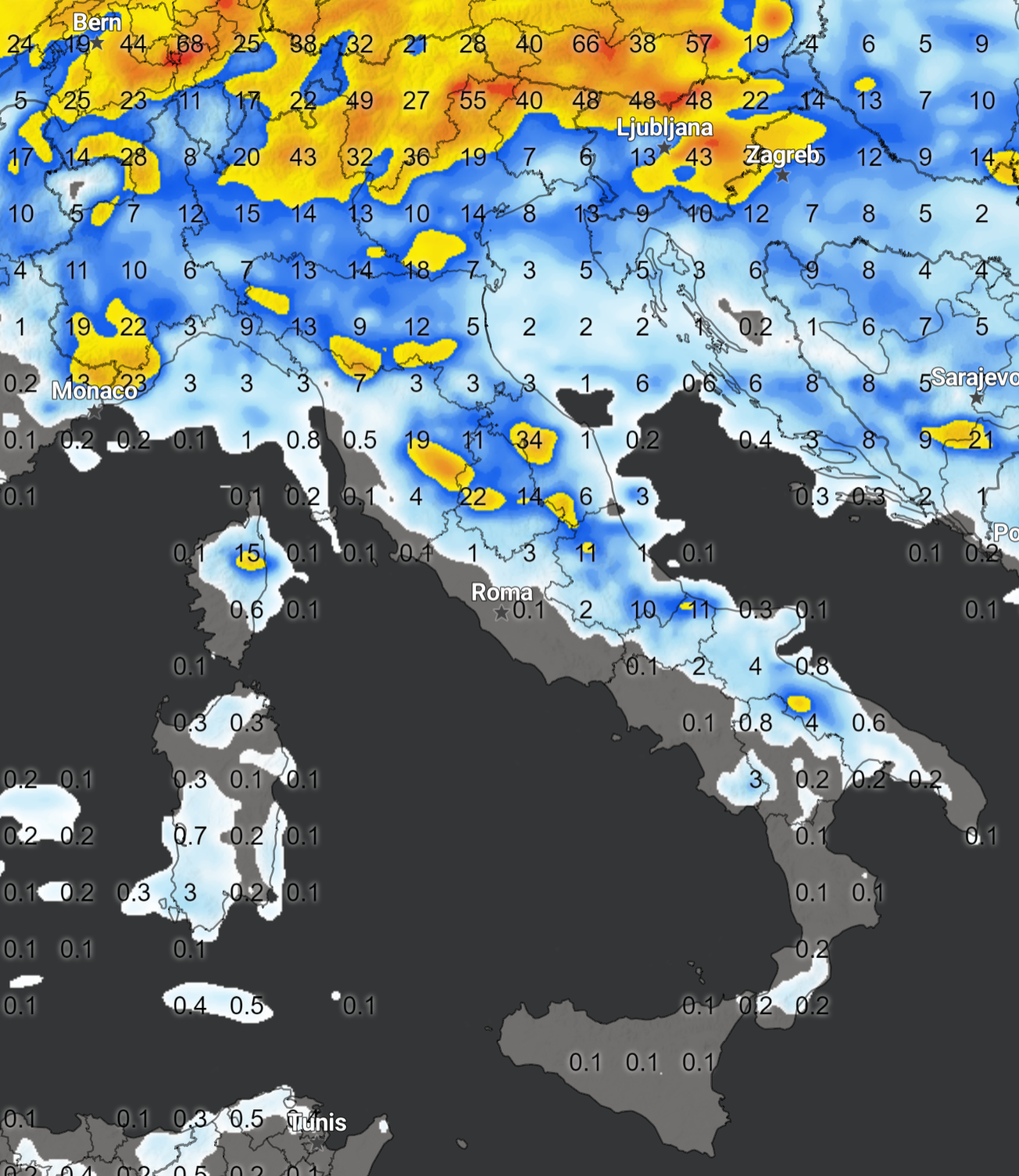 Nell’elaborato delle piogge che saranno perlopiù generate da temporali e saranno più generose sulla Lombardia, il Friuli Venezia Giulia, il Trentino Alto Adige ed il Veneto.