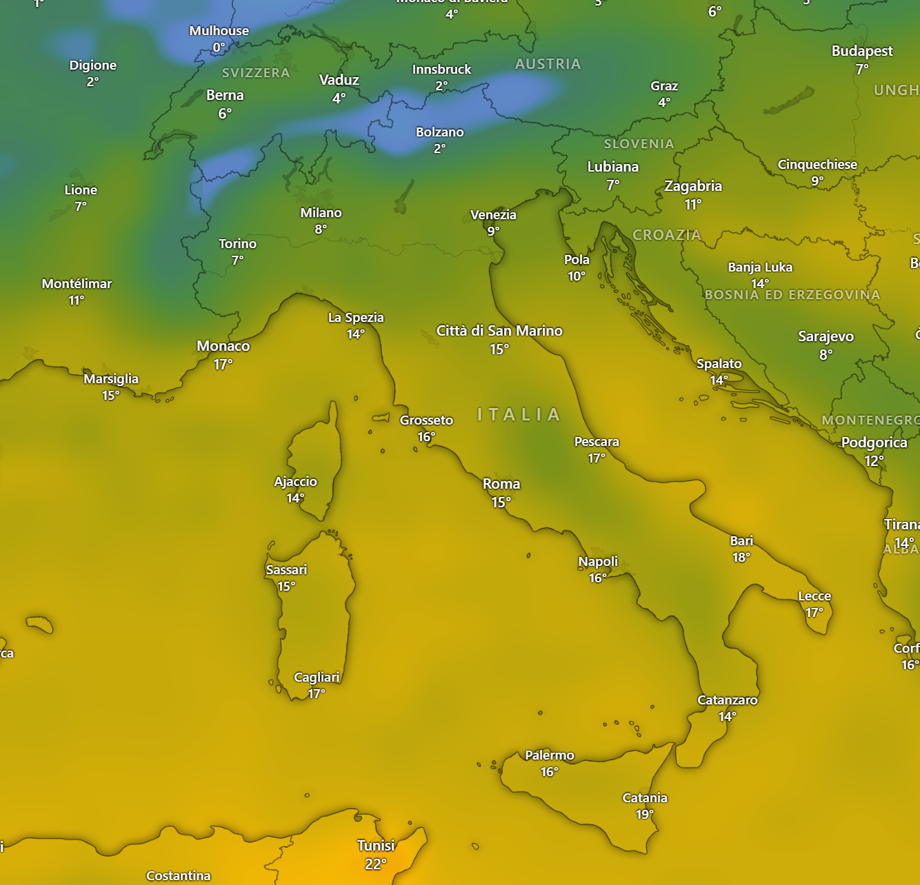 Le temperature subiranno una netta diminuzione su tutto il paese passando dalle temperature miti al centro Sud a temperature più consone per il periodo.