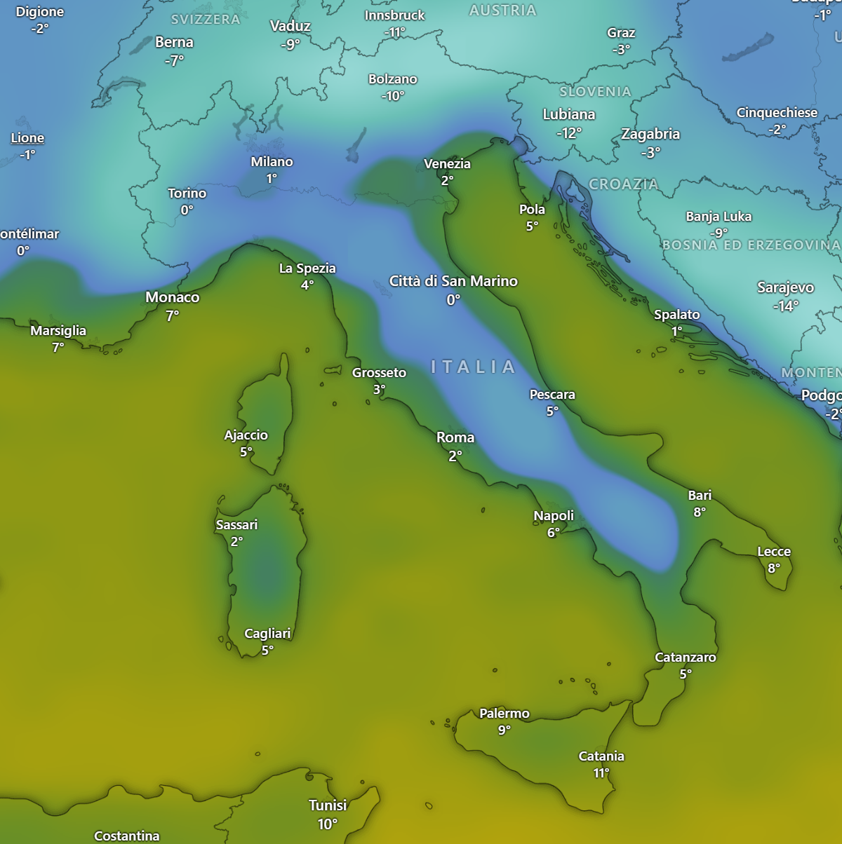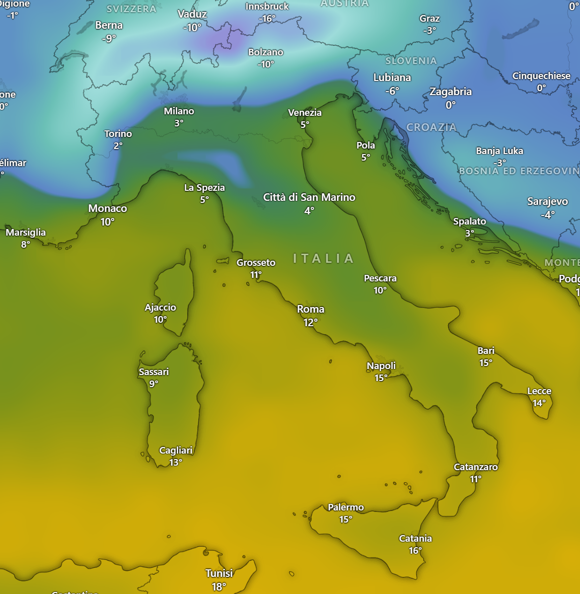 La diminuzione porterà sotto lo zero di molti gradi le Alpi e la dorsale Appenninica, mentre sulla Pianura Padana le temperature saranno prossime allo zero.