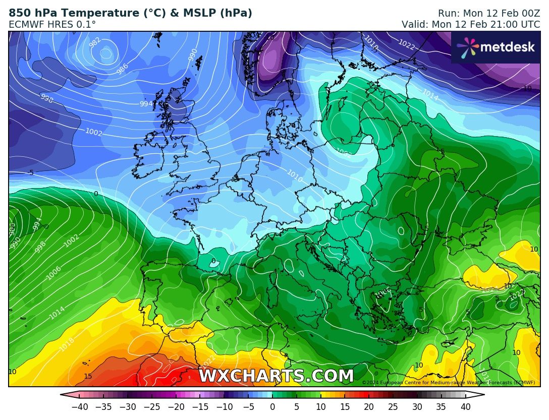 Nell’elaborato previsto per Mercoledì 14 Febbraio vediamo che quella poca aria fredda che sarà riuscita a posizionarsi sul nostro Paese porterà le minime sulle Alpi fino a -10° alle quote medie e dopo un periodo di temperature positive anche in sulla dorsale Appenninica si avranno zone dove si arriverà a -5° mentre sulla pianura padana occidentale vi saranno temperature minime prossime allo zero: