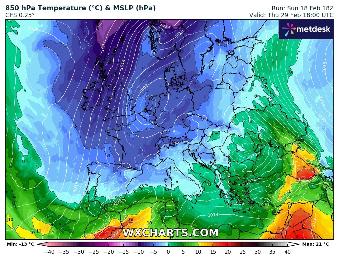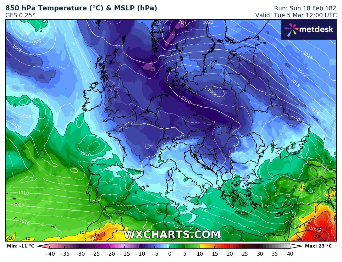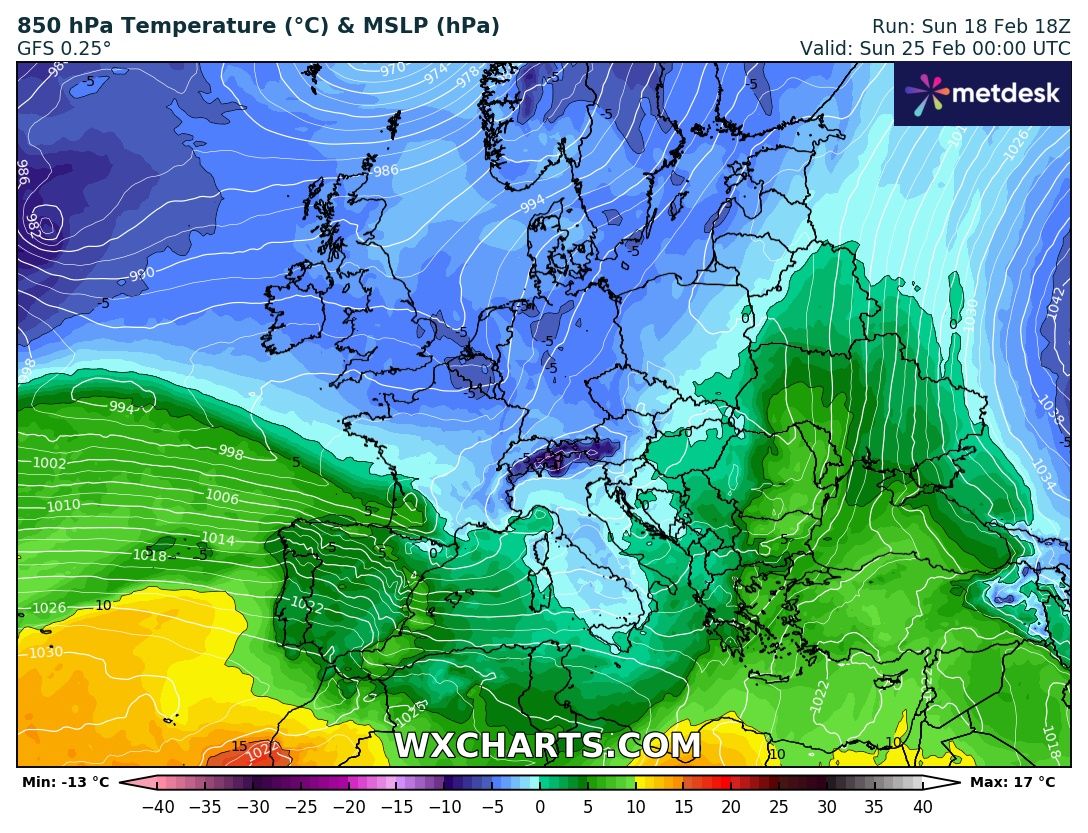 La configurazione prevista per domenica 25 febbraio vede una “omega rovesciata” (i due cicloni uniti dallo stesso corsone ombelicale con le estremità rivolte verso nord) come la chiamiamo noi, cioè un anticiclone delle Azzorre verso Nord e stessa cosa per l’anticiclone Africano oltre ad un minor compattamento del getto polare, farebbe scendere un primo impulso di aria molto fredda sul Nostro Paese.