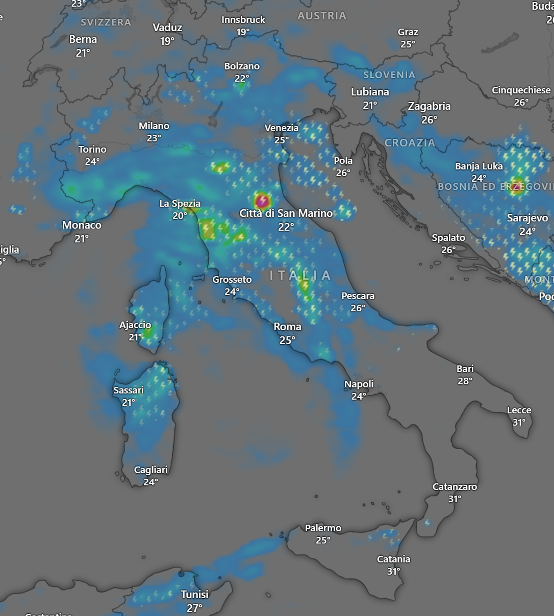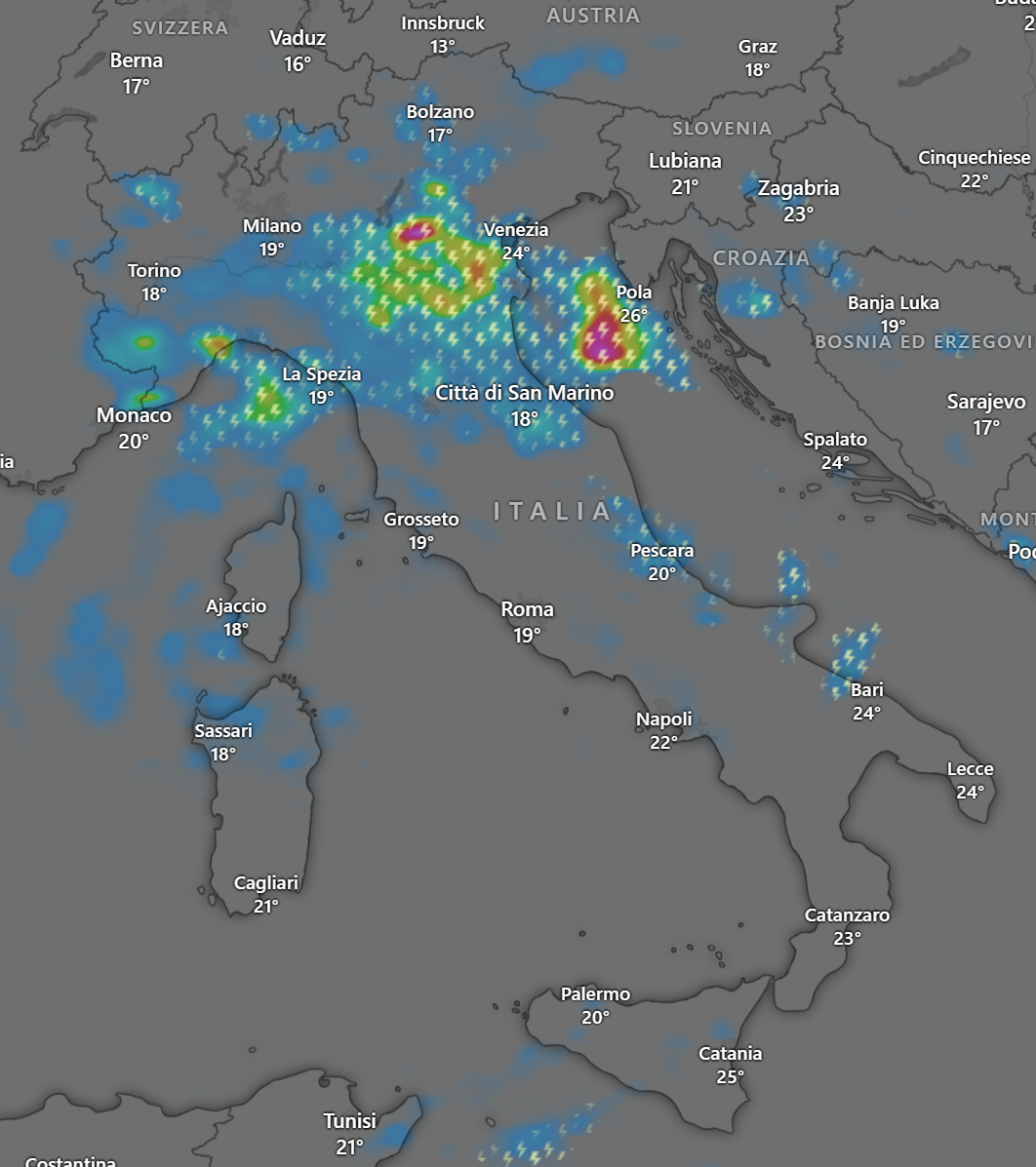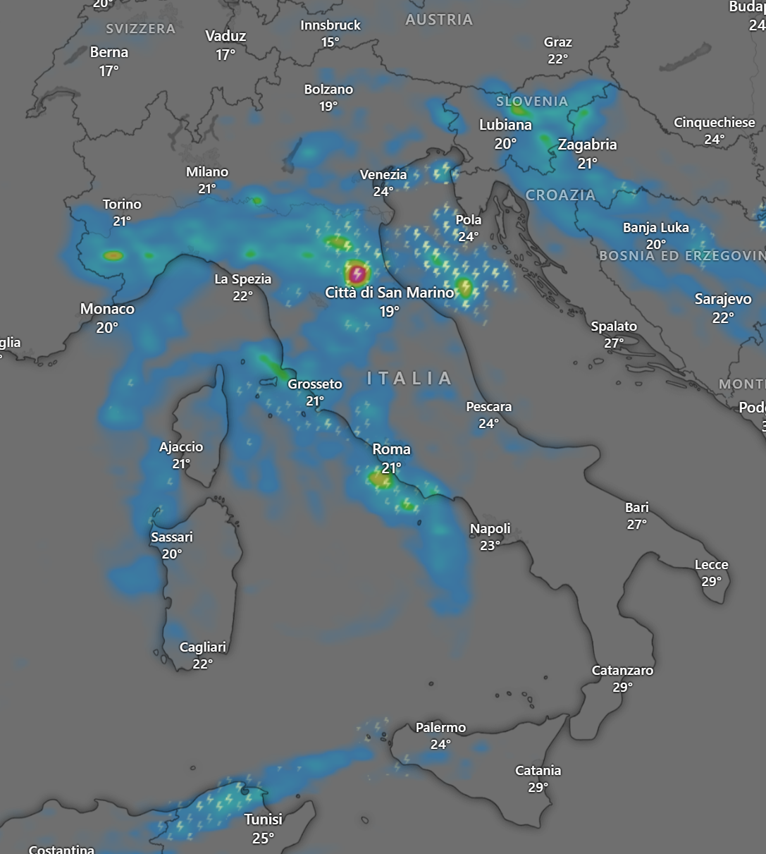 La giornata di Lunedì 24 Giugno 2024, sarà caratterizzata da diffusi temporali su quasi tutto il Centro Nord, anche di forte intensità con alluvioni lampo, grandine di grosse dimensioni, forti colpi di vento e frequenti fulminazioni.