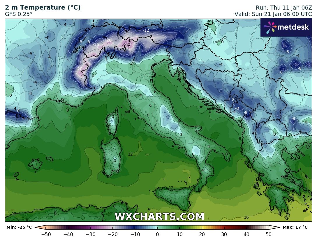 Mentre questo è il quadro delle temperature che subirebbero un netto abbassamento su tutti i settori con punte di -20° sulle Alpi e -7° in appennino oltre ad essere prossime allo zero su gran parte del Paese: