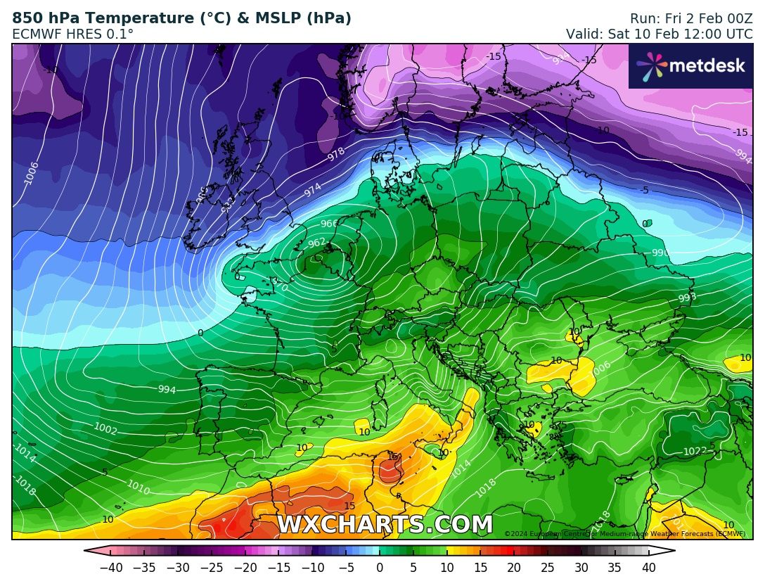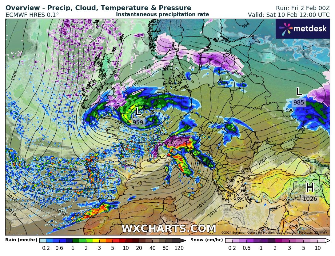 Il modello Europeo ECMWF vede un ciclone con il suo centro di 960 hPa sui Paese Bassi e maltempo fino sull’Italia con pioggia e neve sulle Alpi, con accumuli importanti delle precipitazioni: