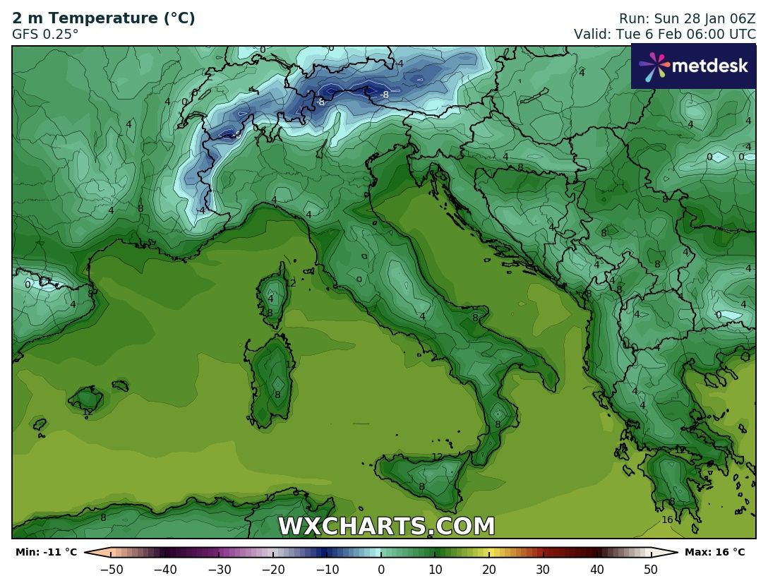 In questo elaborato vediamo le temperature minime previste al suolo per Martedì 6 Febbraio e variano tra i -8 delle Alpi mentre sul resto della penisola saranno comprese tra lo zero del Nord fino ai 10° al Sud con punte di 12° sulle Isole Maggiori: