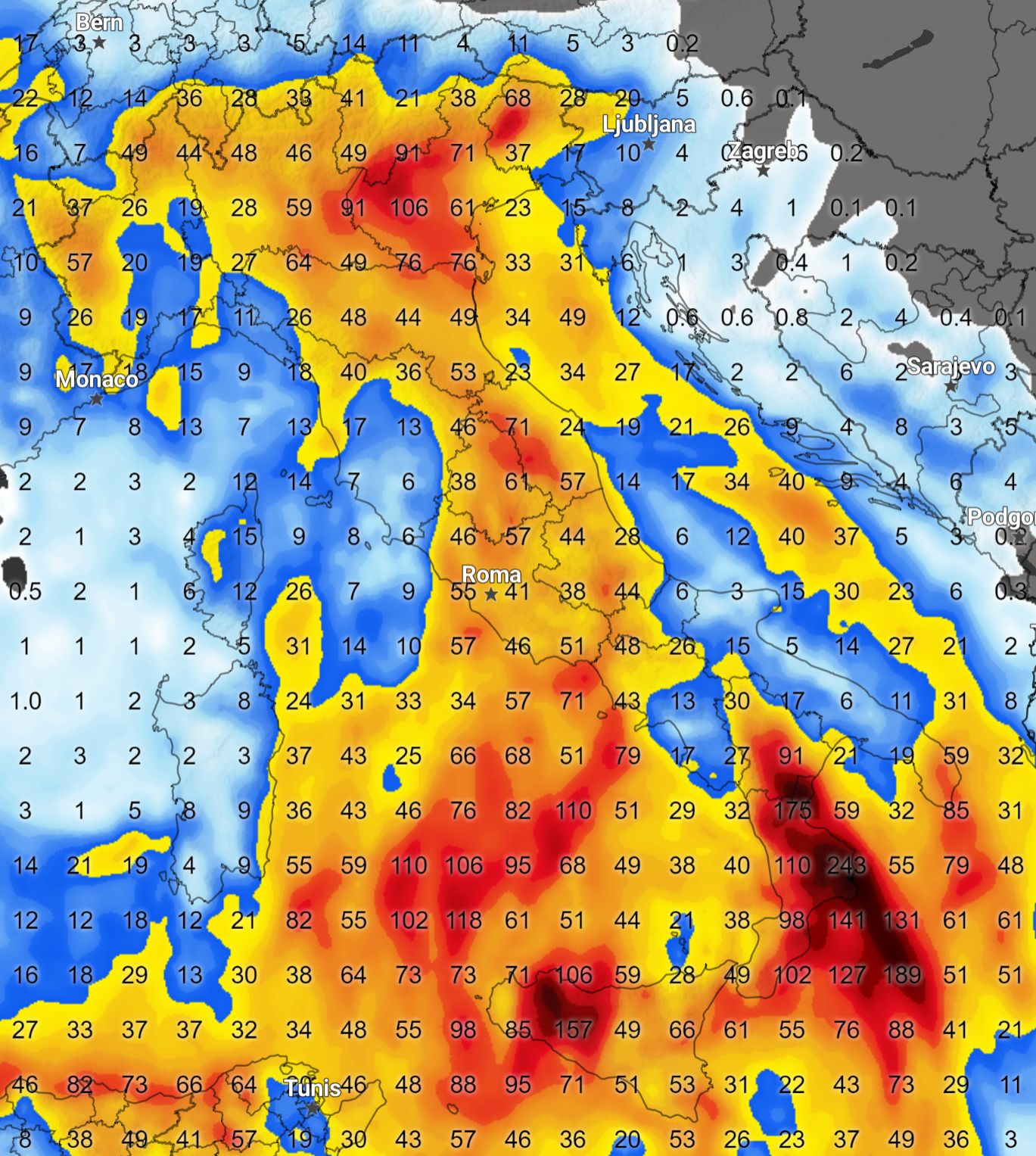 I numeri che vedete sono i millimetri di pioggia previsti e considerate che ogni millimetro di pioggia corrisponde ad un litro di acqua per metro quadro.