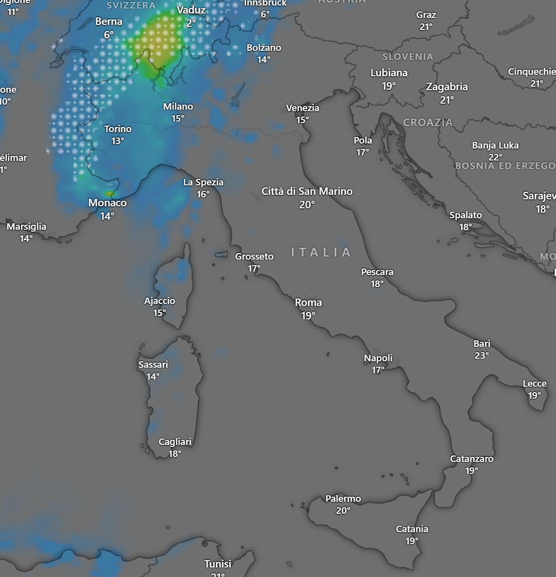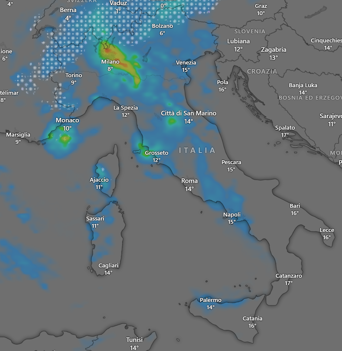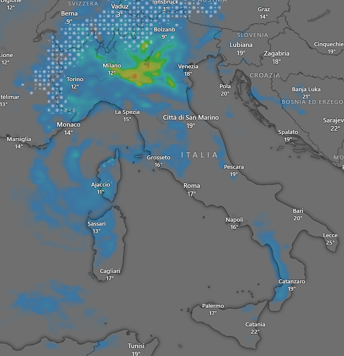Alle ore 13 i fenomeni diverranno più intensi, sulla Lombardia, l’Emilia Romagna ed il Veneto, con temporali anche di forte intensità, con locali grandinate, forti raffiche di vento e frequenti fulminazioni, mentre continueranno le nevicate sulle Alpi a quote medio alte.