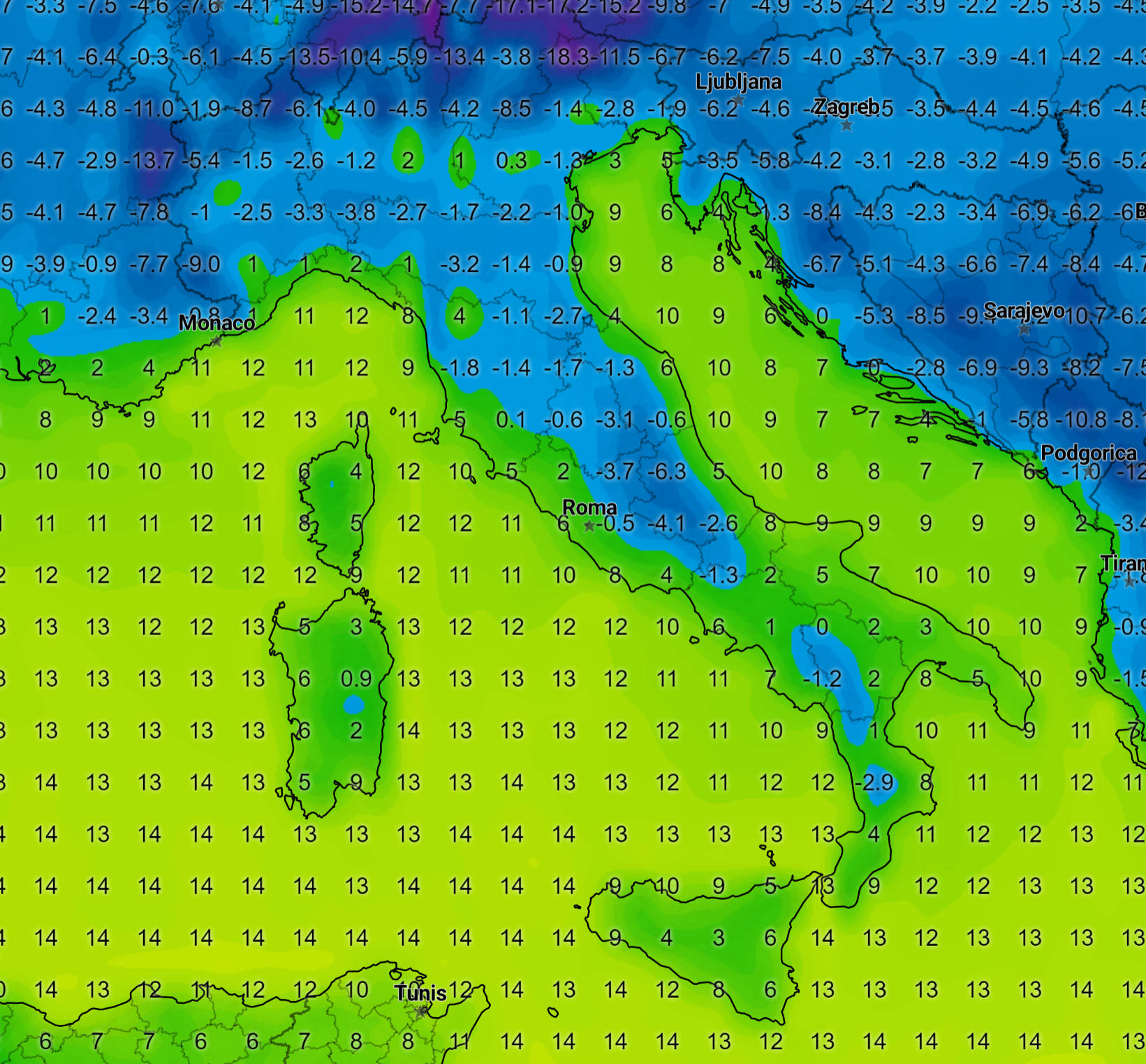 Come vediamo nel grafico previsto per Sabato 13 Gennaio le temperature minime sulle Alpi raggiungeranno ancora i -20° mentre in pianura padana saranno di qualche grado sotto lo zero come anche sull’Appennino centro settentrionale dove si raggiungeranno i -7°:
