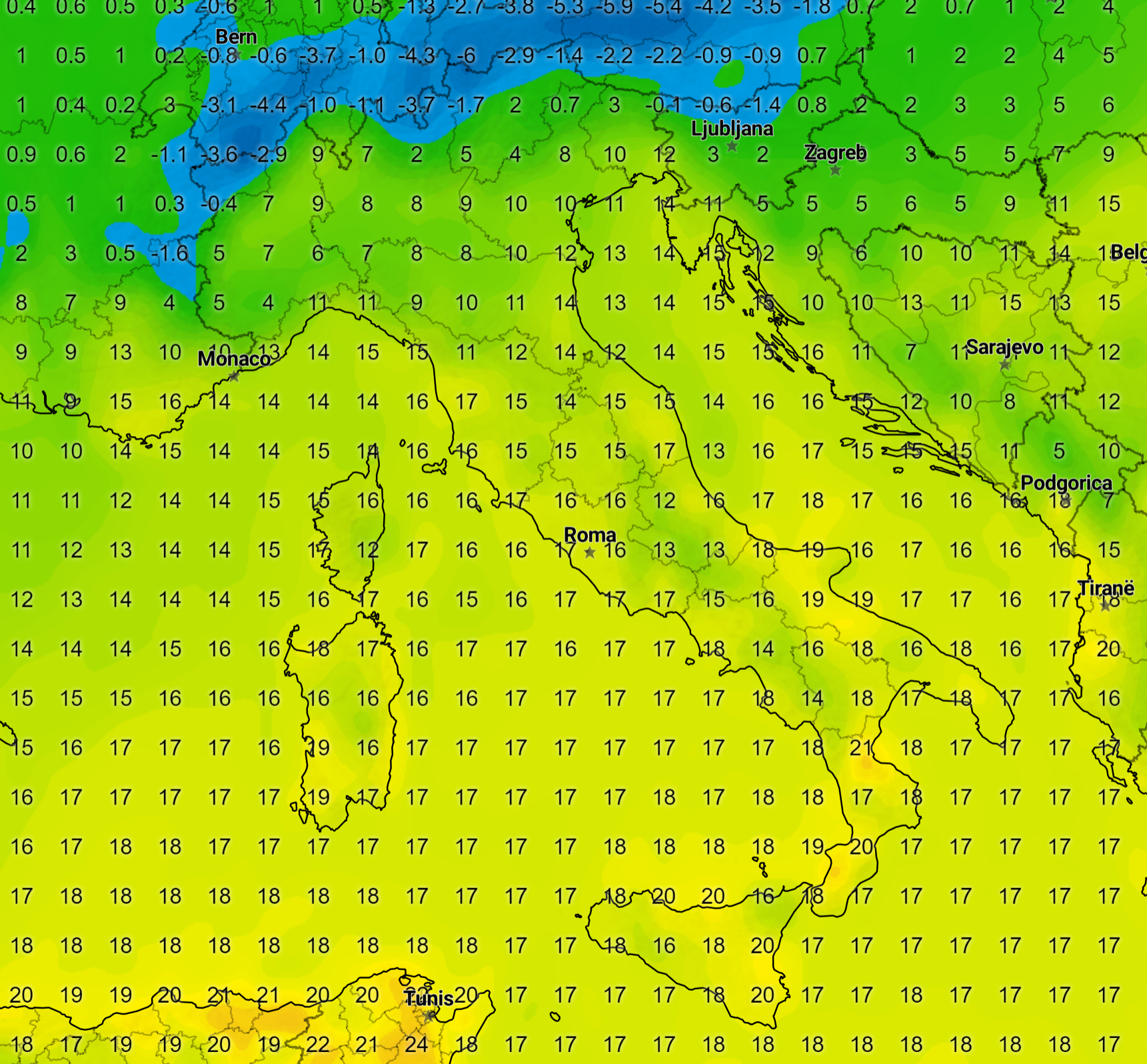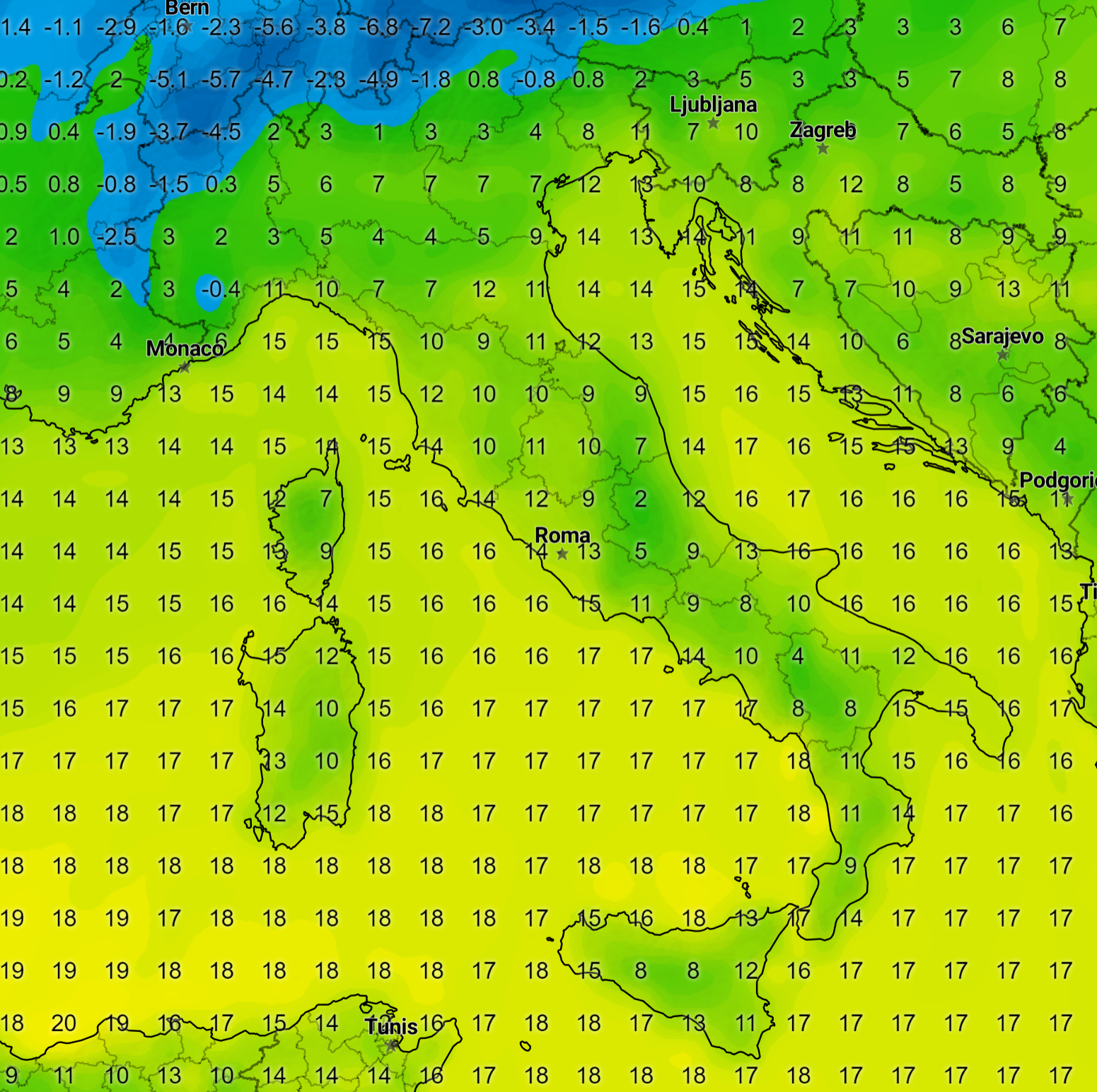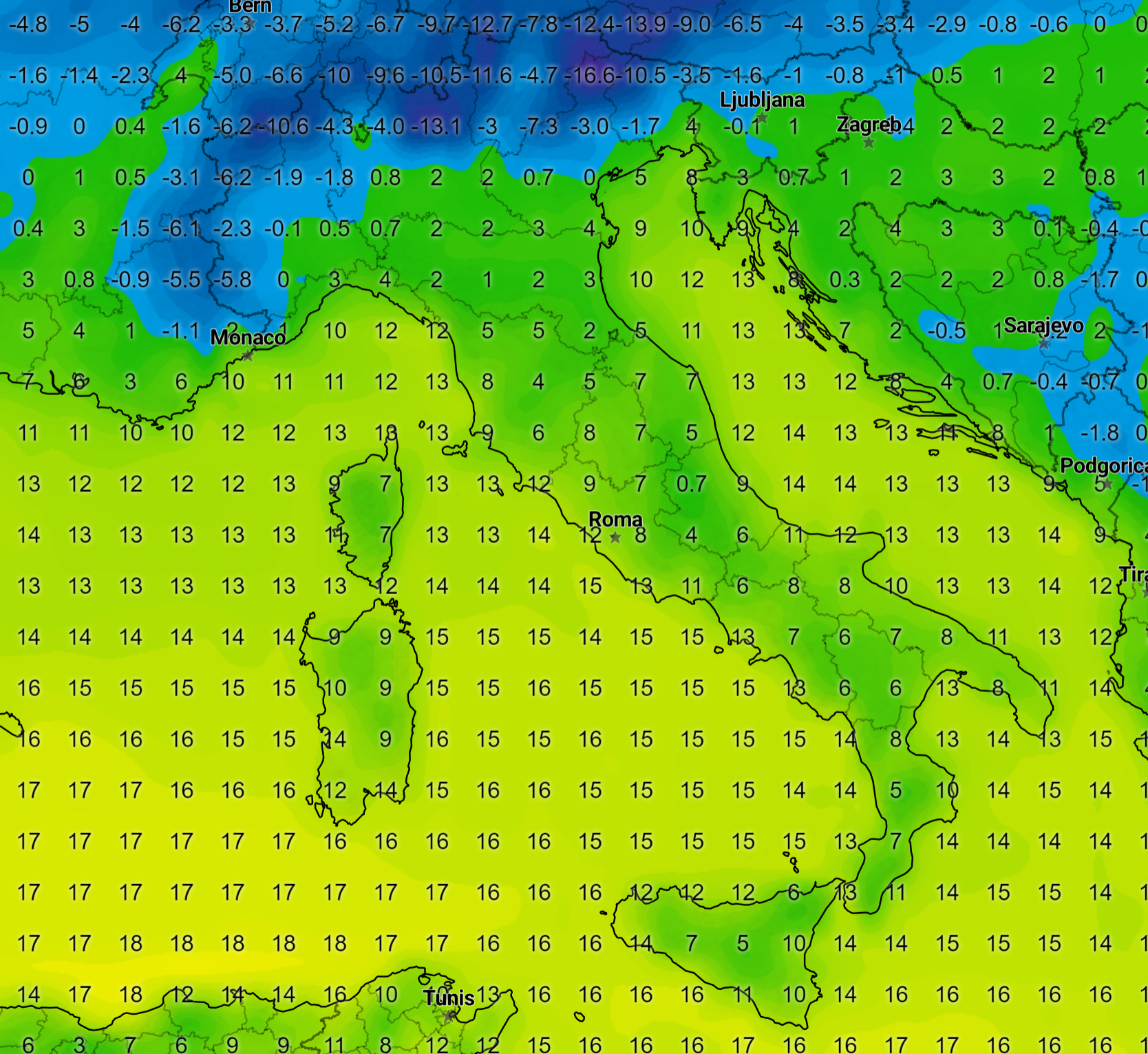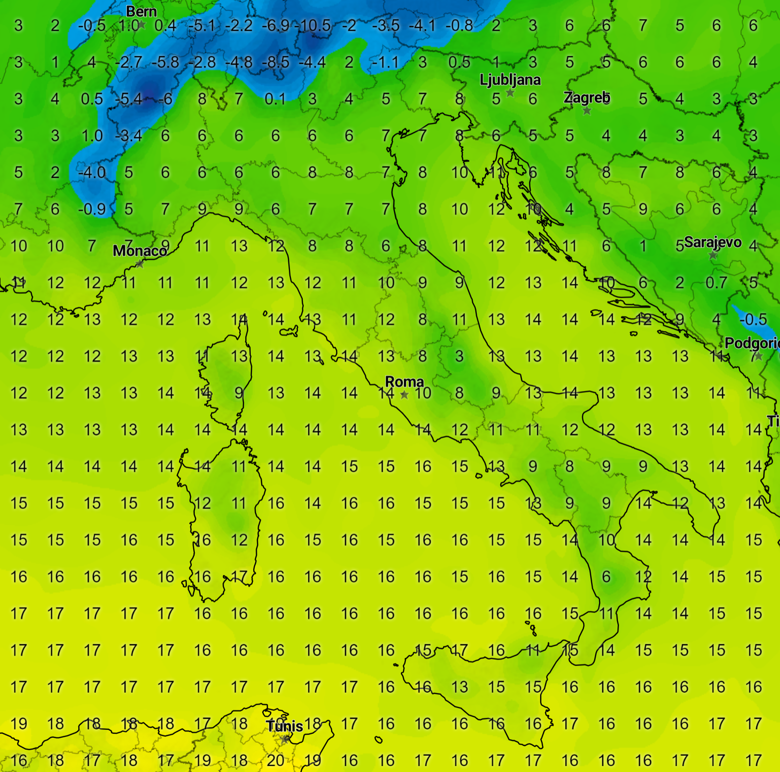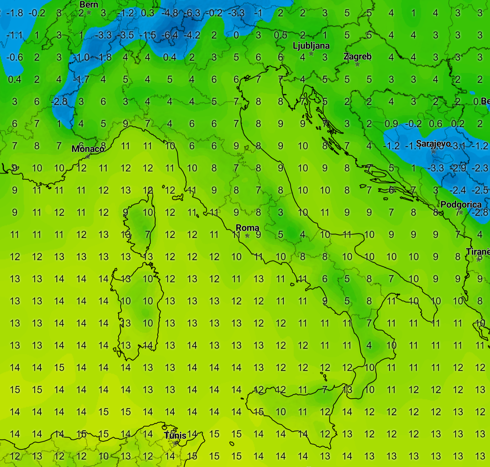 Da Lunedì 15 vi sarà un graduale addolcimento delle temperature a causa dell’arrivo dell’Anticiclone Africano versione invernale, e come vediamo dal grafico delle temperature minime il freddo rimarrà relegato sulle Alpi: