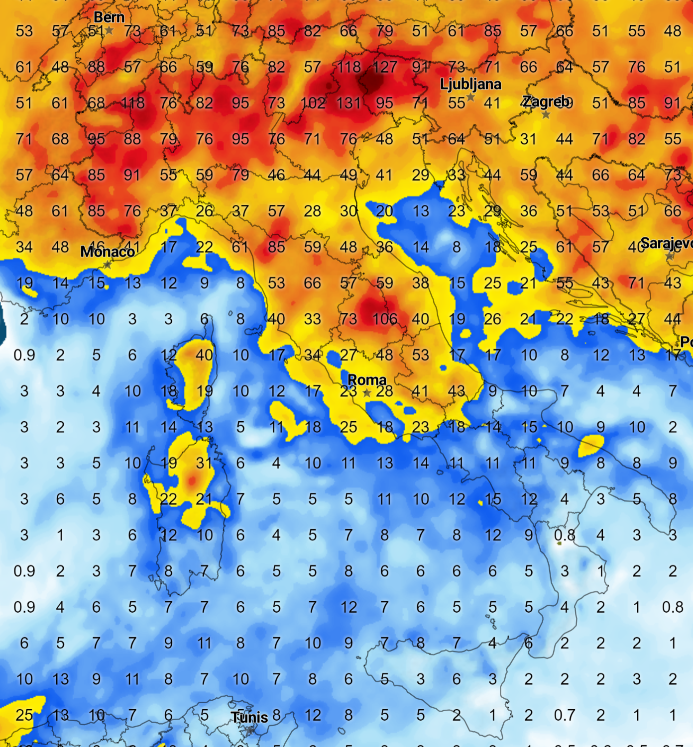 I numeri che vedete sono i millimetri di pioggia previsti e considerate che ogni millimetro di pioggia corrisponde ad un litro di acqua per metro quadro (clicca per ingrandire):