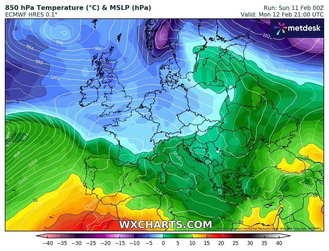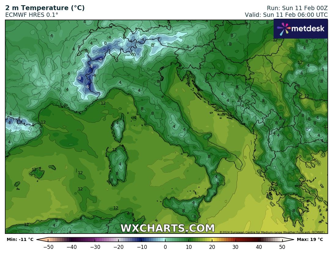 In questo elaborato del Modello Europeo ECMWF delle temperature a 850 hPa (circa 1550 metri d’altezza) previsto per Lunedì 12 Febbraio, notiamo appunto che l’apporto di aria molto fredda ma non gelida rimane sull’Europa centrale e si ferma sulle Alpi senza riuscire a sfondare sulla Penisola: