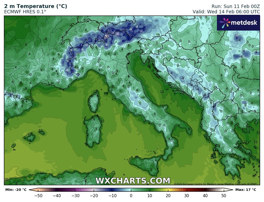 Se invece guardiamo l’elaborato delle temperature minime di Mercoledì 14 Febbraio, notiamo come l’aria fredda abbia raggiunto tutti i settori, portando le minime sulle Alpi fino a -20° e sotto lo zero la catena Appenninica e alcune zone della Pianura Padana: