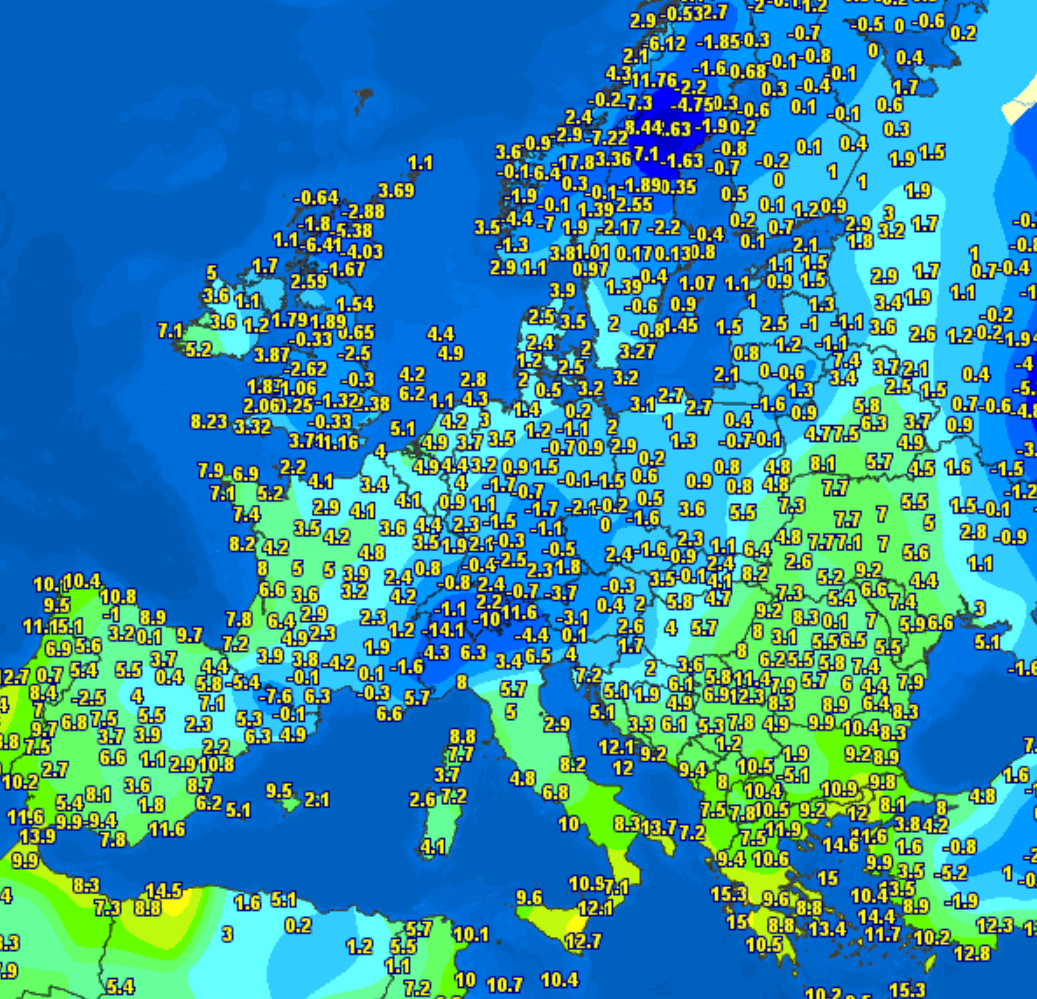 Questo è l’elaborato di questa notte, delle temperature minime dove si evince il blocco di aria fredda che dal Nord Europa arriva fino sul Nord Italia: