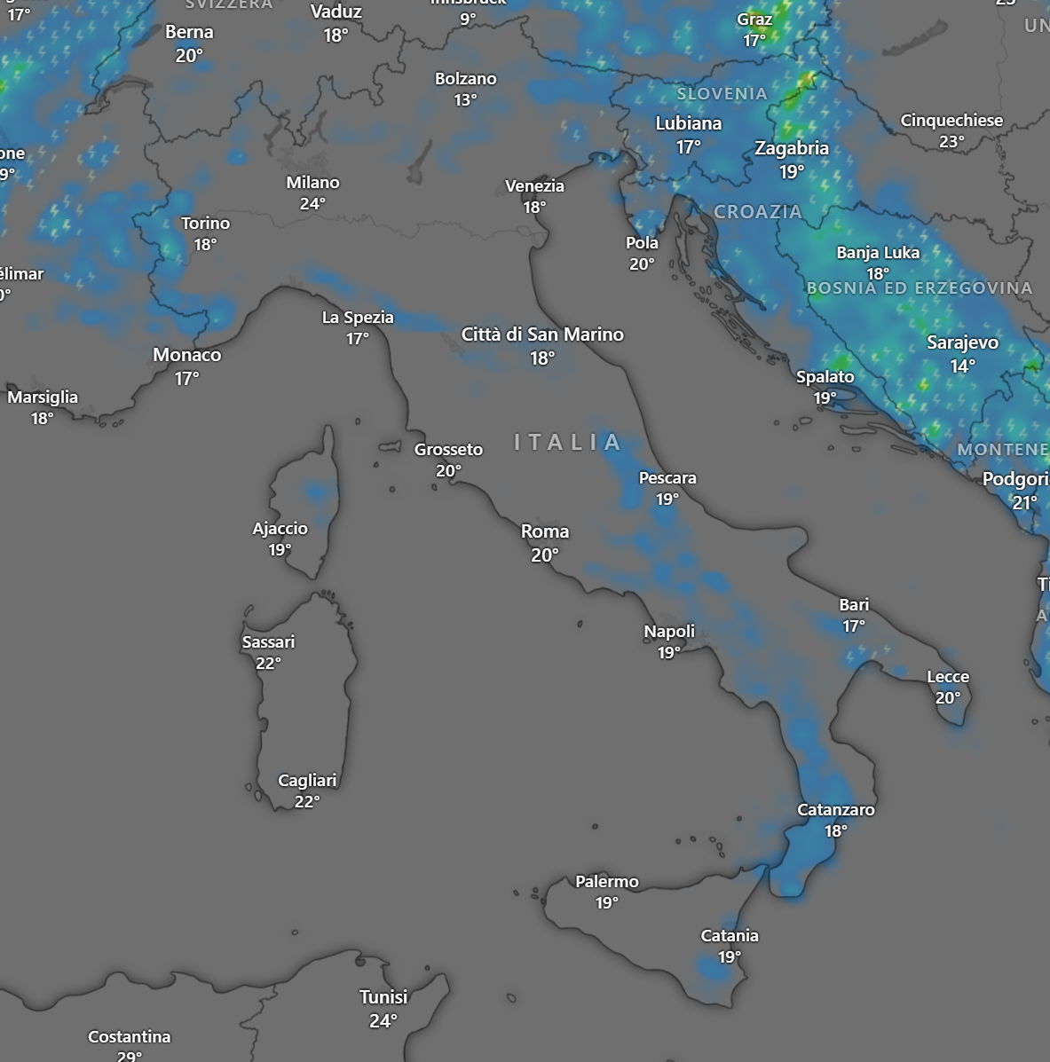 Sempre nel pomeriggio potranno svilupparsi temporali sulle Alpi del Piemonte oltre che sull’Appennino del Sud: