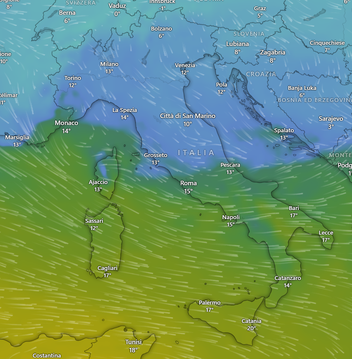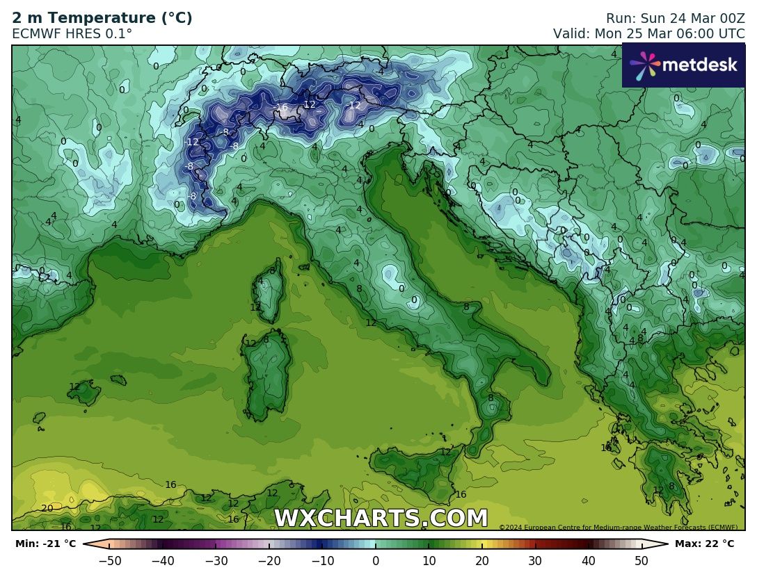 Le temperature minime previste per la mattinata di Lunedì 25 Marzo sono fino a -20° sulle Alpi, mentre al Nord e sulla dorsale Appenninica oscilleranno tra lo zero ed i 4°, al Centro tra i 4 e gli 8° ed infine al Sud e sulle Isole maggiori tra gli 8 ed i 12°.
