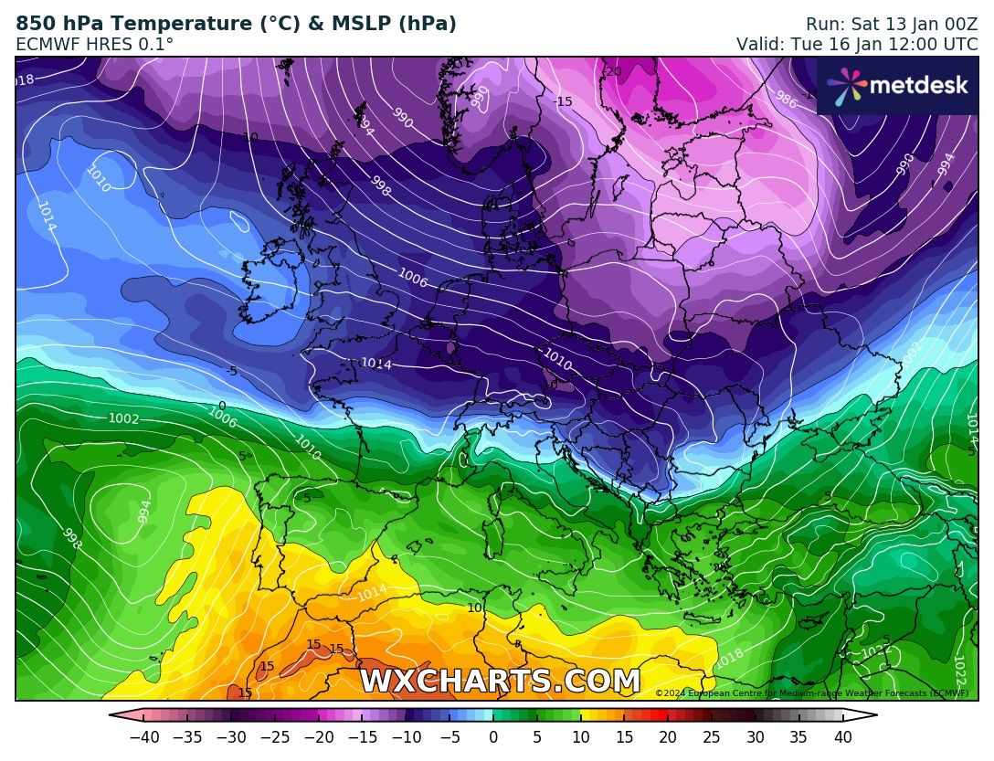 Volgendo lo sguardo a Martedì 16 notiamo un anticiclone Africano in espansione sul Mediterraneo dove porterà temperature oltre al media su quasi tutto lo Stivale, ad eccezione del Nord che rimarrebbe sotto un flusso di correnti più fredde: