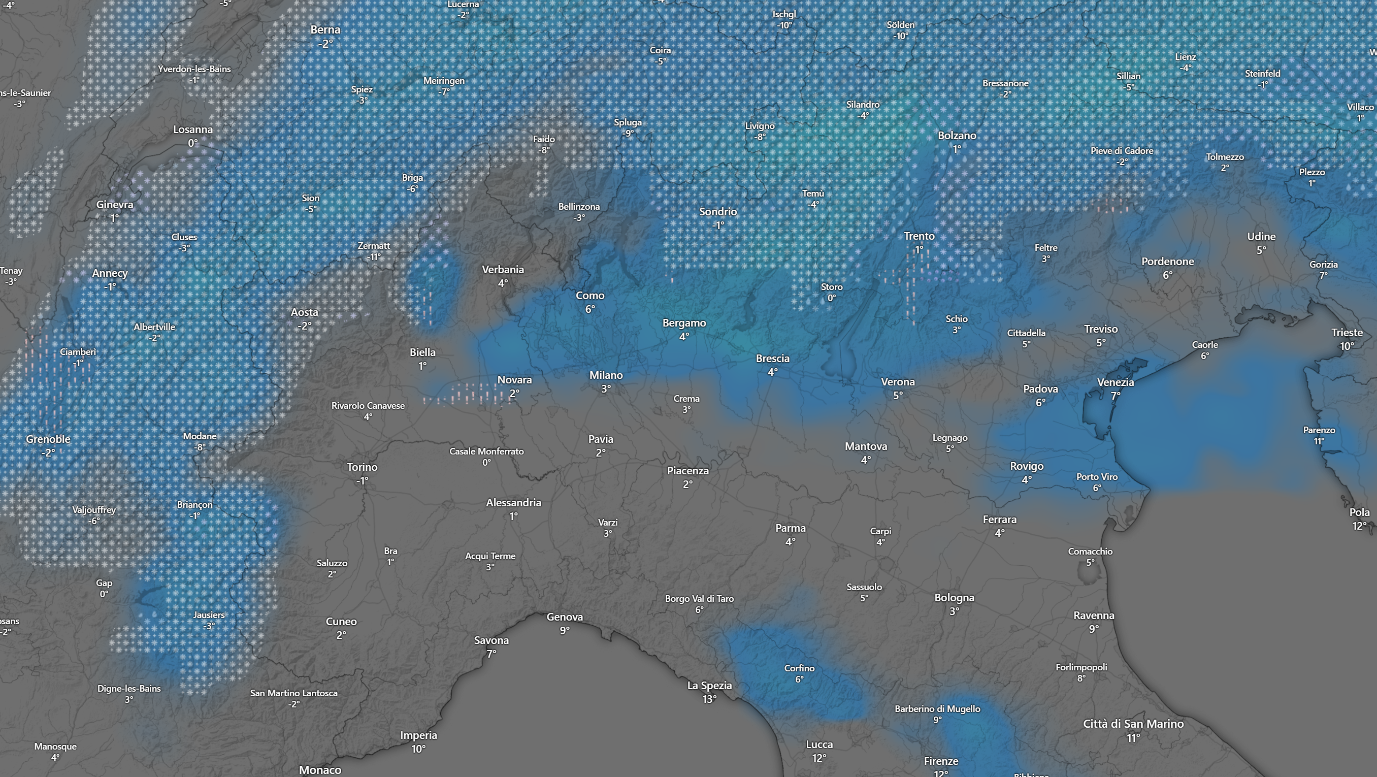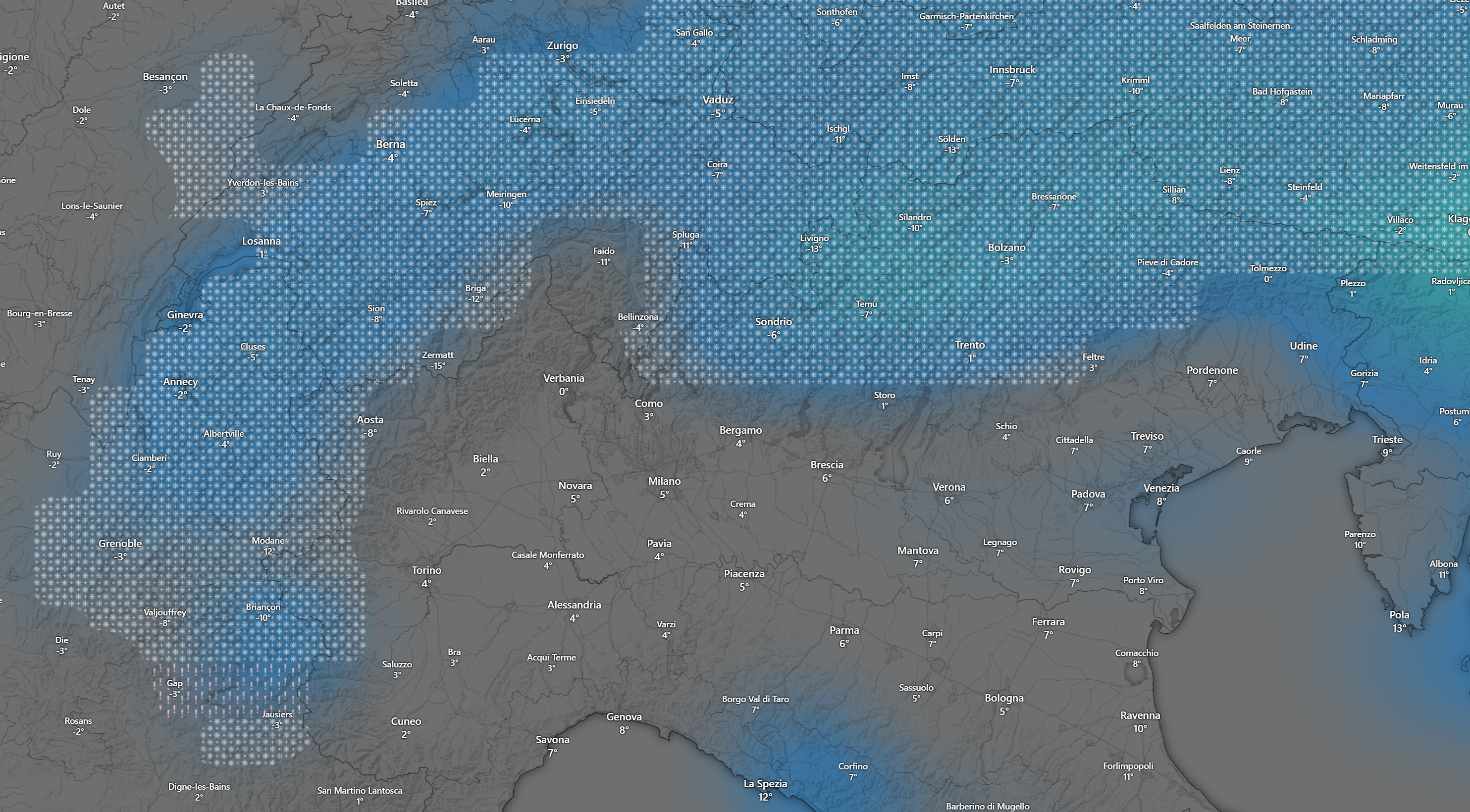 Con il passare delle ore cesseranno le nevicate sulle Alpi centro occidentali e continueranno su quelle orientali ed inizieranno sull’Appennino Tosco Emiliano: