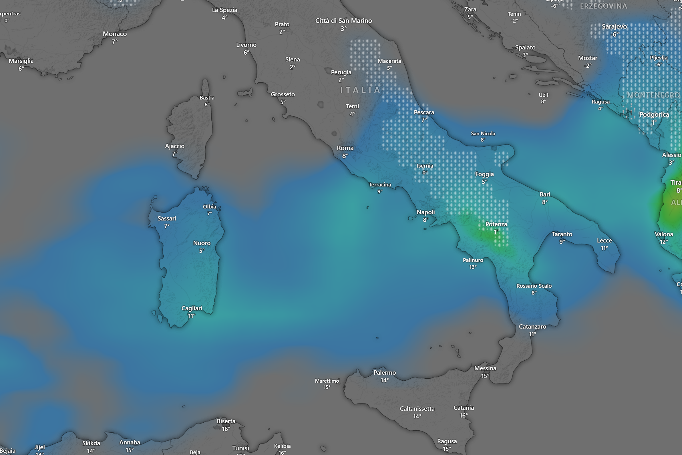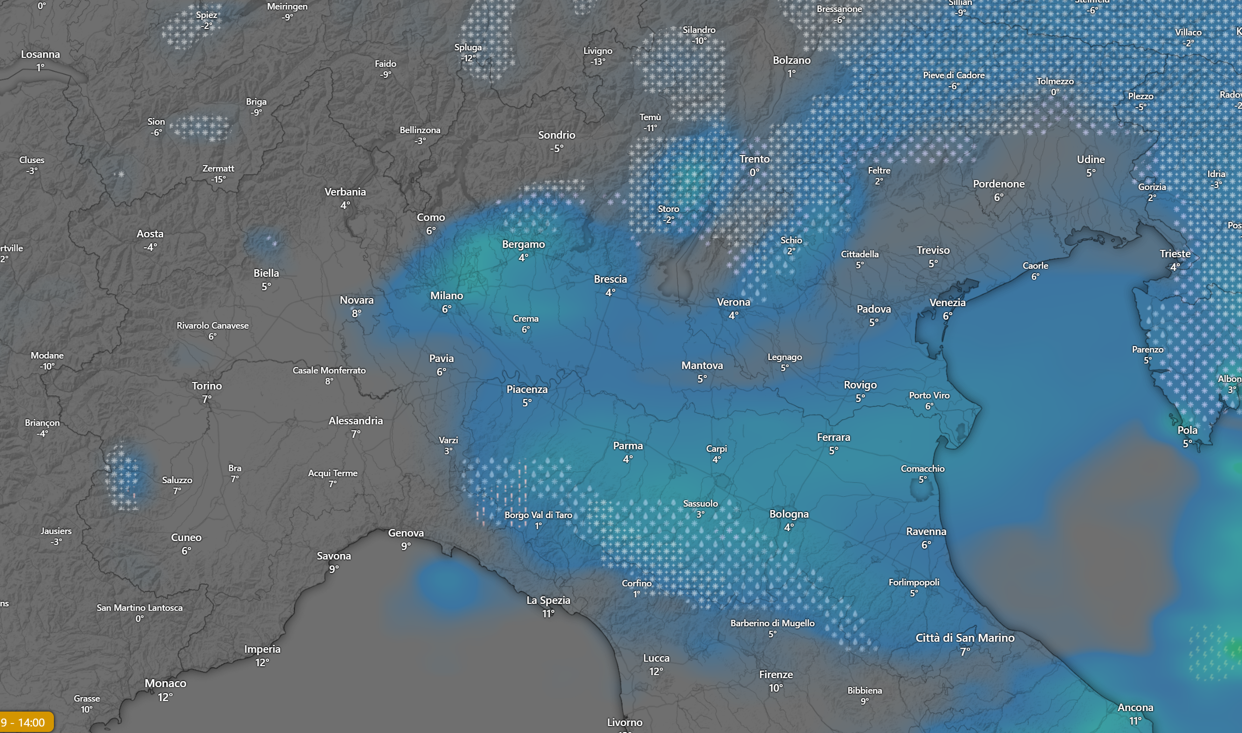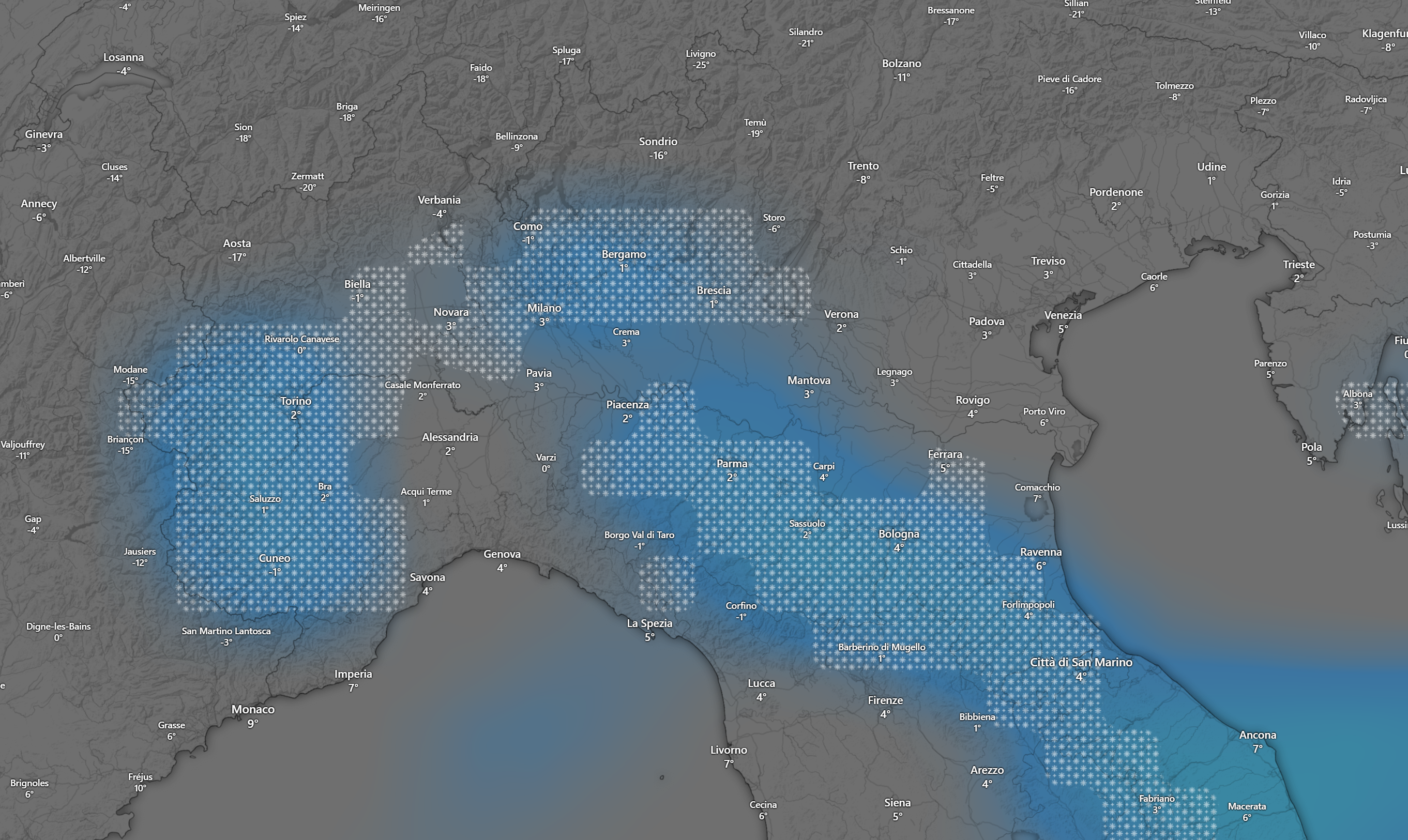 Con il passare delle ore la neve raggiungerà l’Appennino e varie zone della pianura padana come da grafico: