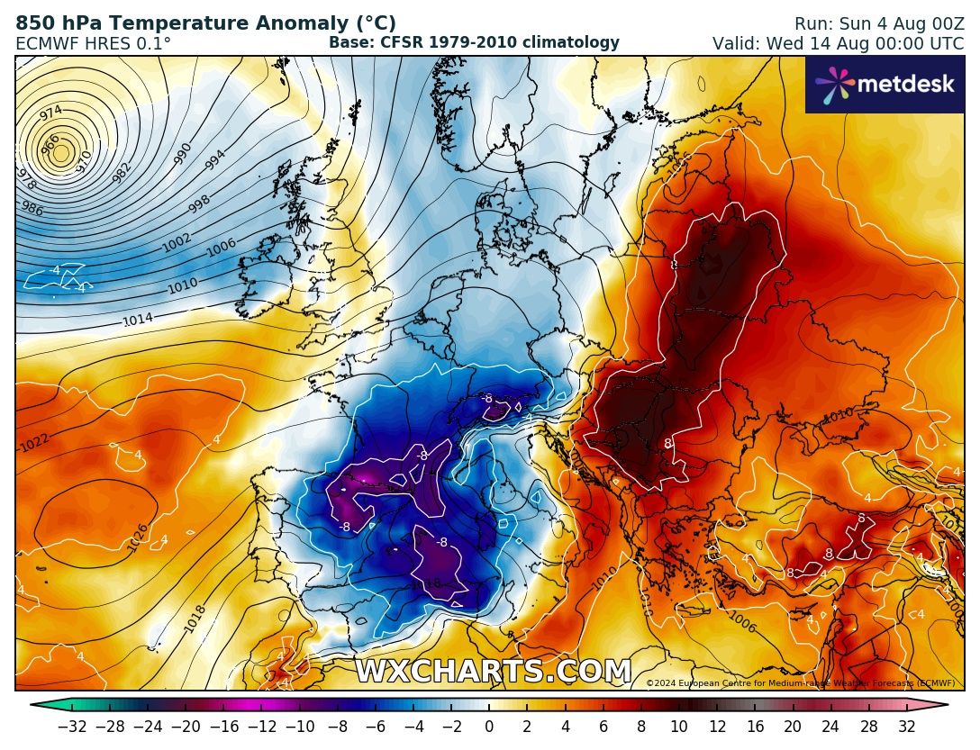 La novità di oggi è che il modello Europeo ECMWF ad alta risoluzione (tra i più affidabili al mondo) si è allineato con il collega Americano, e nella giornata di Martedì 13 Agosto, prevede la stessa configurazione ad omega rovesciata con due Anticicloni ai bordi e l’Italia proprio nel centro dell’omega.