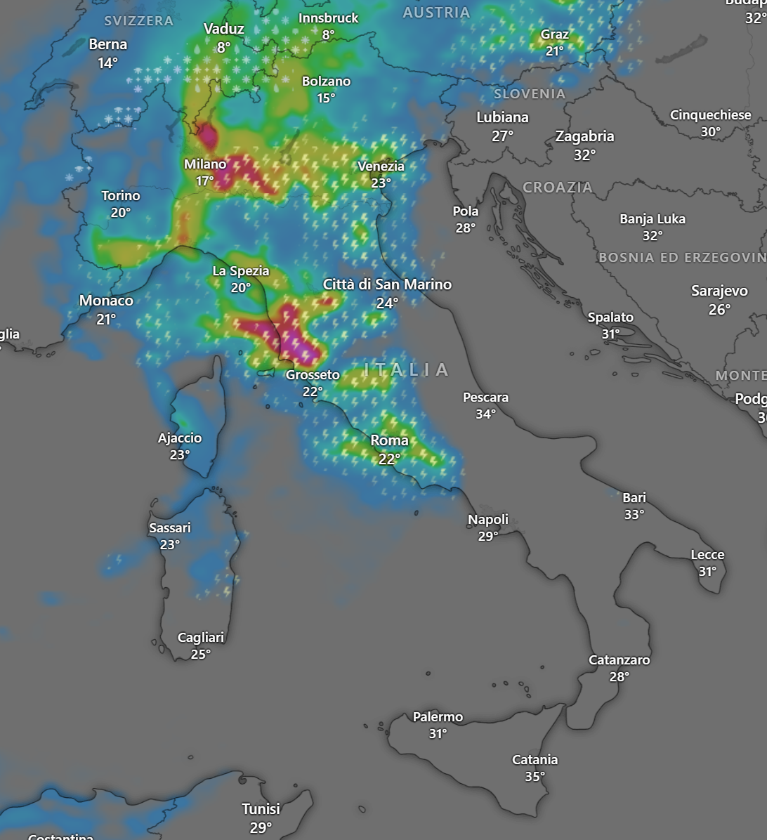 Sono previsti anche intensi Temporali con possibili alluvioni lampo, grandine di grosse dimensioni, frequenti fulminazioni e forti raffiche di vento, oltre a possibili nevicate sulle Alpi al di sopra dei 2000 metri (da confermare).