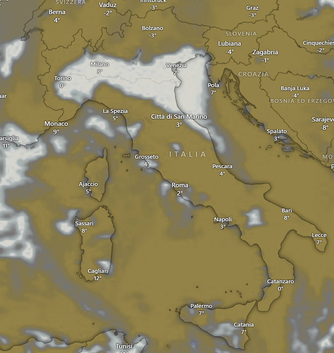 Questo è l’elaborato previsto per sabato 27 che mostra come tutta la val padana è avvolta dalla nebbia: